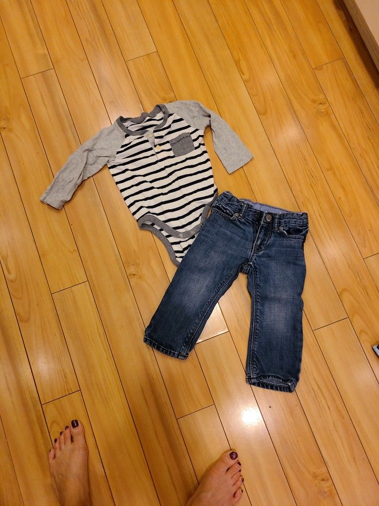 Love these little jeans and onsie Onesie is 12/18 but my son wore it with the pants.