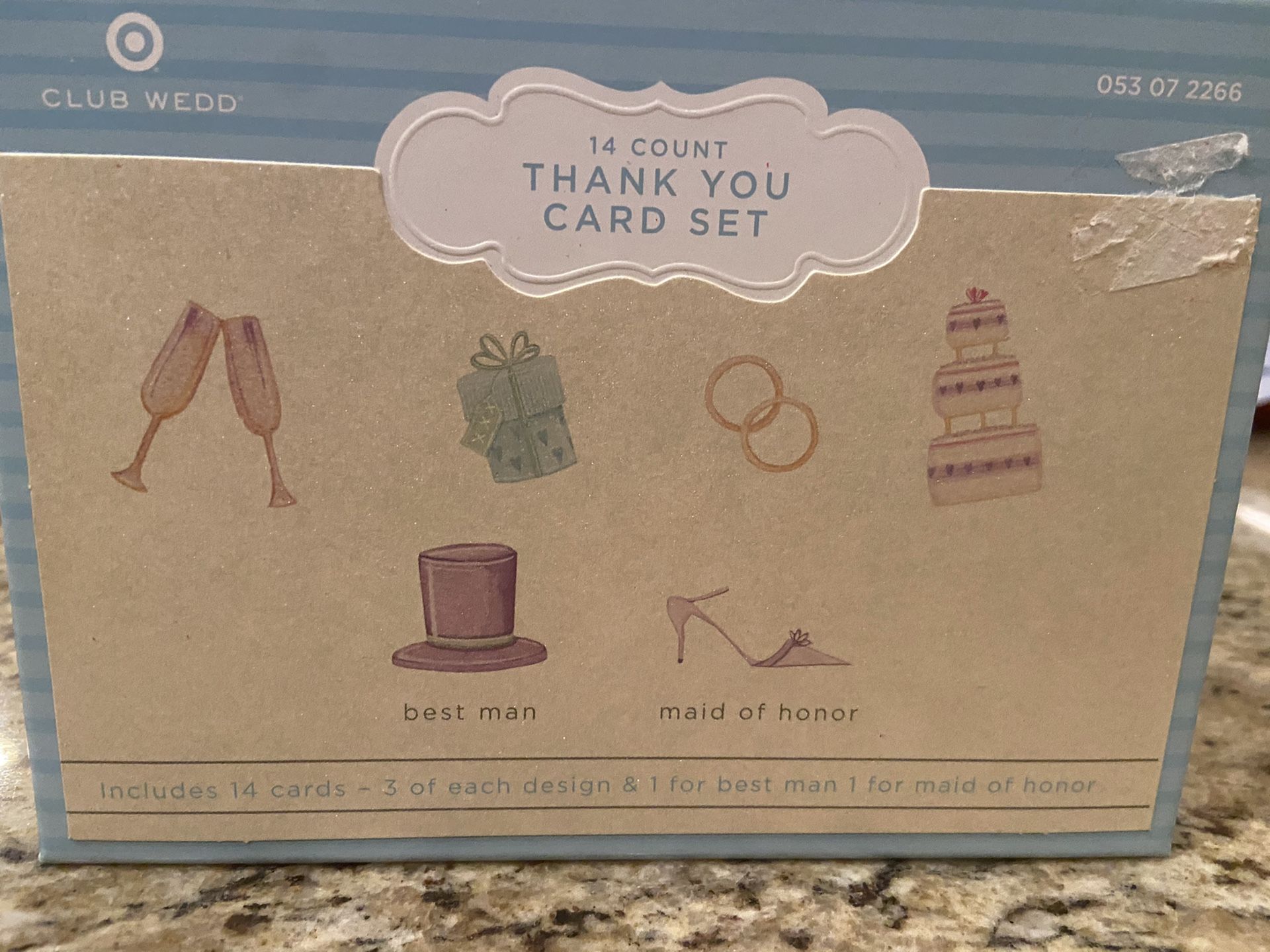 From Target Club Wedd. 14 Thank you card set for your wedding day. 3 of each design on the box and 1 specifically for your best man & maid of honor. Selling one box for $5.00. I have 2 new boxes if interested.