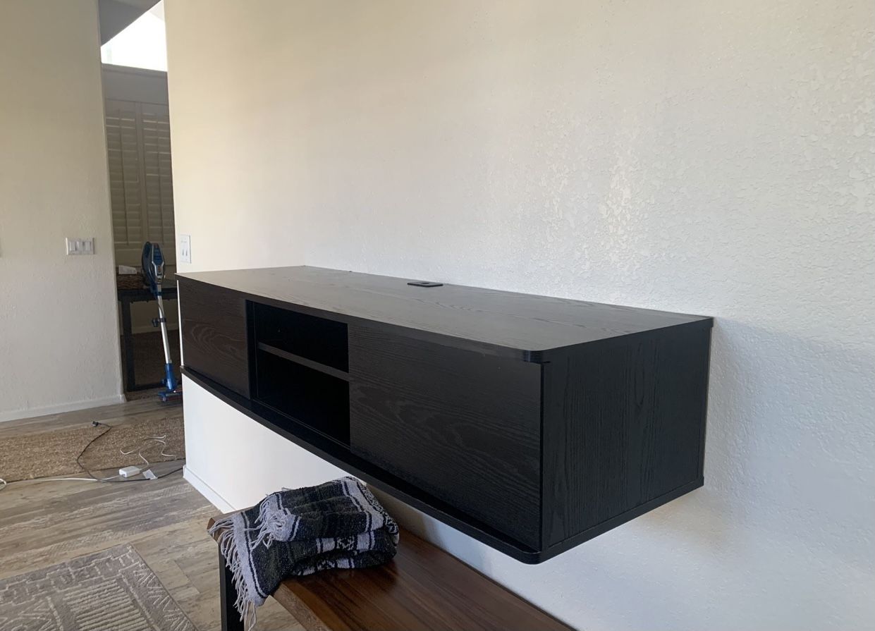 Selling this mounted TV console! It’s been in storage since about March this year, before that it was lightly used for a bout a year. Really easy to mount and still in great condition. A couple water spots on the top but that’s about it. Has three compartments with 2 sliding doors. 57 inches long 17 1/2 inches wide We lost the piece to hang it that’s why we marked it down. You can purchase Z Clips on Amazon for it!