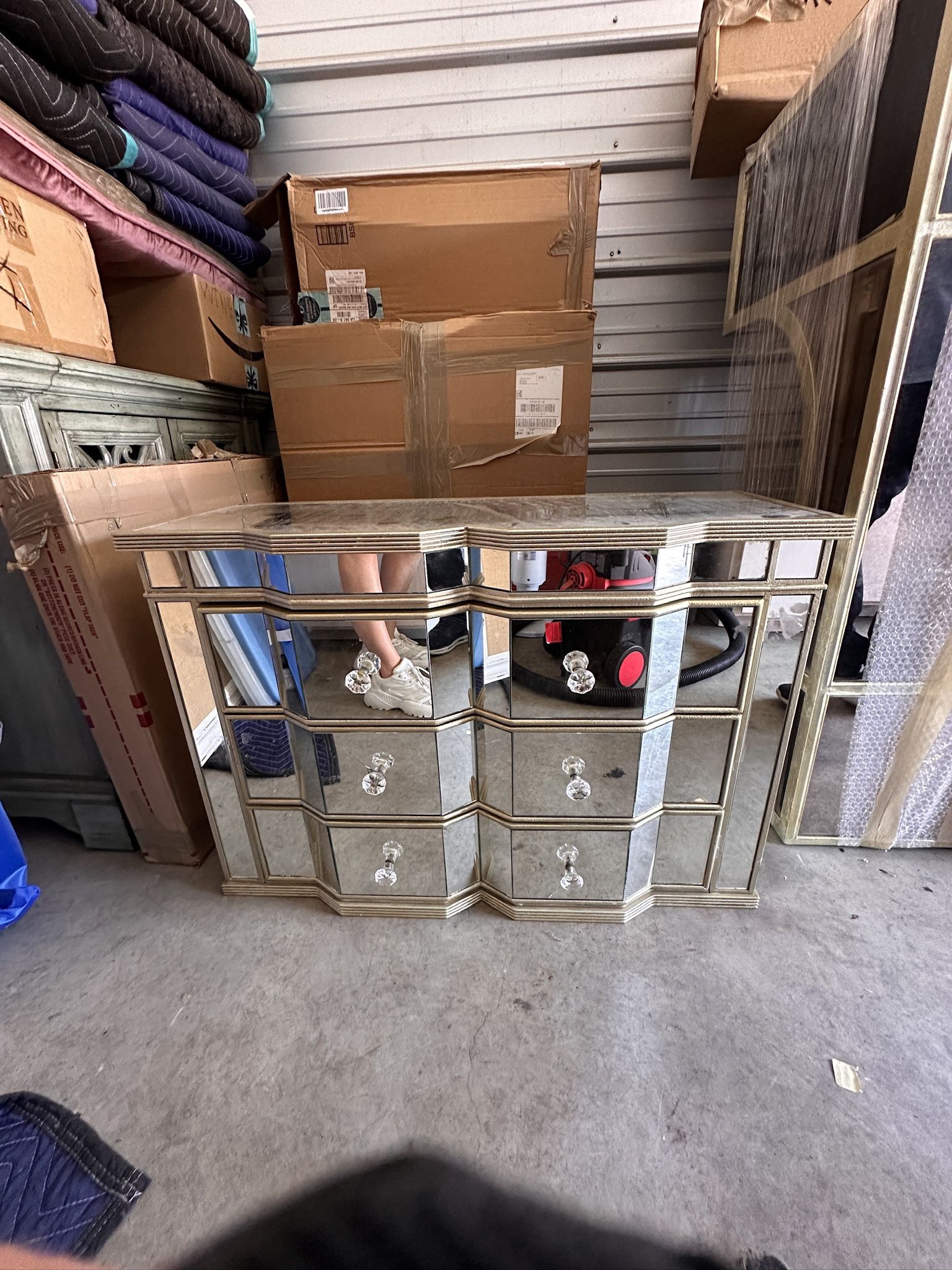 Mirrored dresser, art deco/hollywood regency/purchased in LA. We removed the legs and there is a single crack from our move. 25'' T x 13'' D x 36'' W Asking for $500 or best offer. Retails - $857