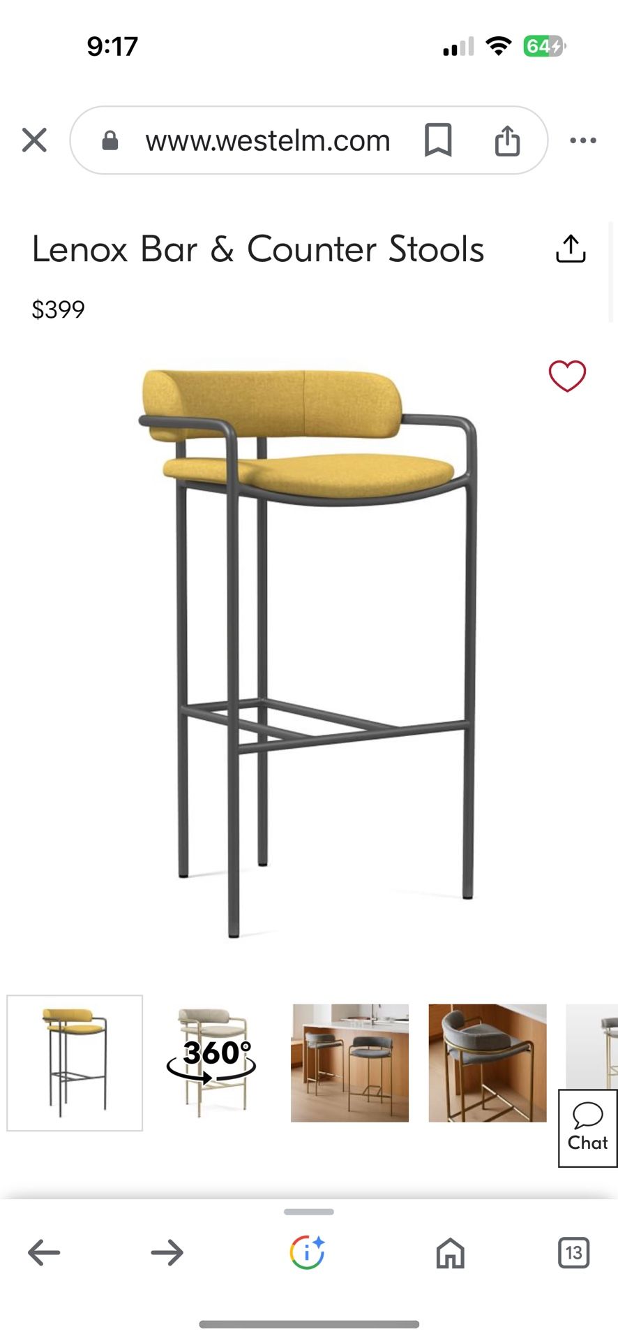 Selling all 4 or 2 sets of 2 @ $125 EACH. Good condition mild discoloration. Selling as is! Hit me up directly if you're interested Feel free to share with friends and family! (Original price $299 EACH!!) Color: Dijon, performance velvet Chrome (mild discoloration) Counter stool height 26” height Serious inquiries only!! MUST PICK UP ITEM! PRICE FIRM!!