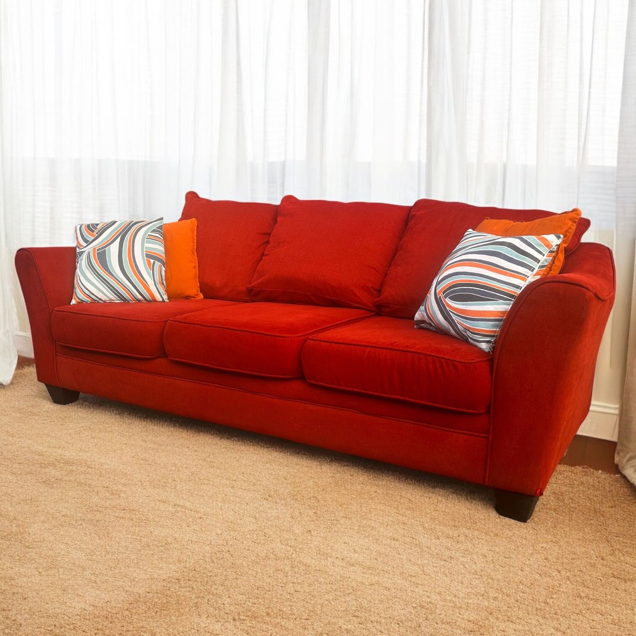 Comfortable Cushions, Smooth Fabric, Removable Covers, Clean. Santa Monica Red Sofa by Rooms To Go. Excellent Shape. Original Condition. Dimensions: 96in Long, 38in Deep, 18in Seat, 39in Tall. Pickup in 92109 or Delivery with Zipcode.