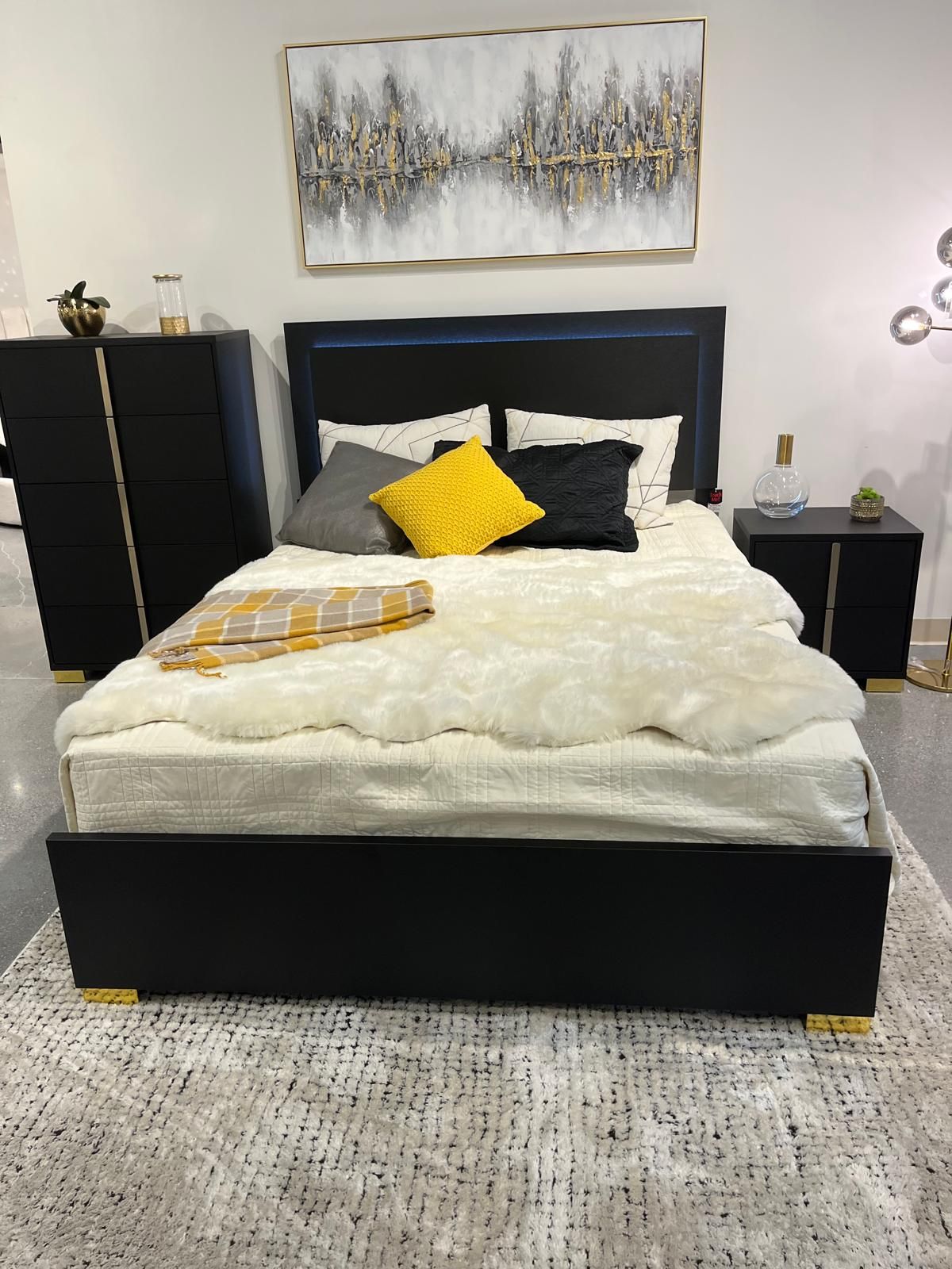 Available in Queen Bedroom Set & King Bedroom Set 3 Pc Queen bedroom set includes: Queen bed, Dresser, Mirror * LED headboard with touch switches for easy operation * Dresser topped with framed mirror for added storage and style * Mood lighting creates a lovely ambiance in the bedroom * Sleek black finish with gold accents for a contemporary look