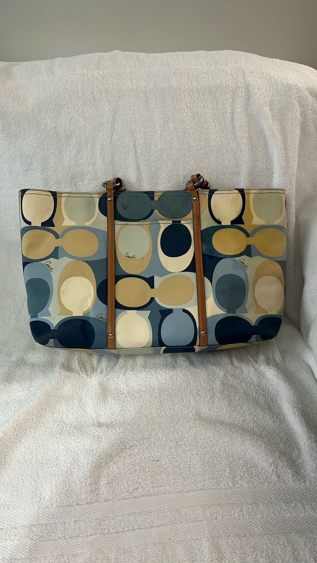 Has Tan, Light blu, Navy blu, and leather tan handle. It’s 18 inches wide x 10 1/2 inches long. Asking 95.00 firm