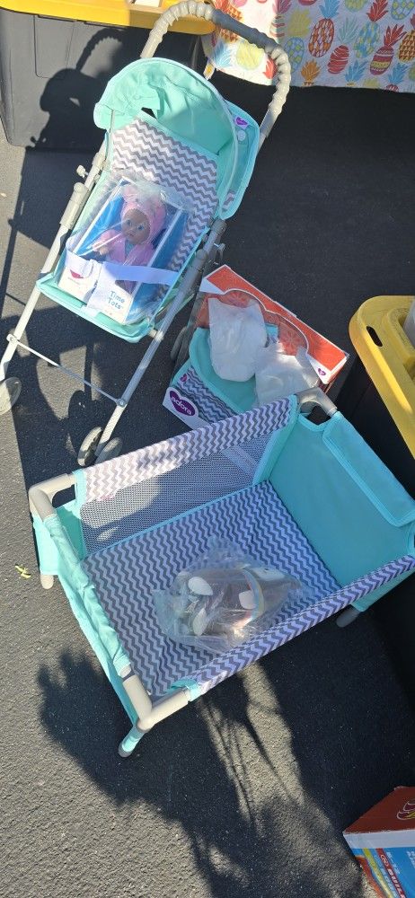 Stroller, Crib, Diaper Bag , Baby Doll And Plush Set