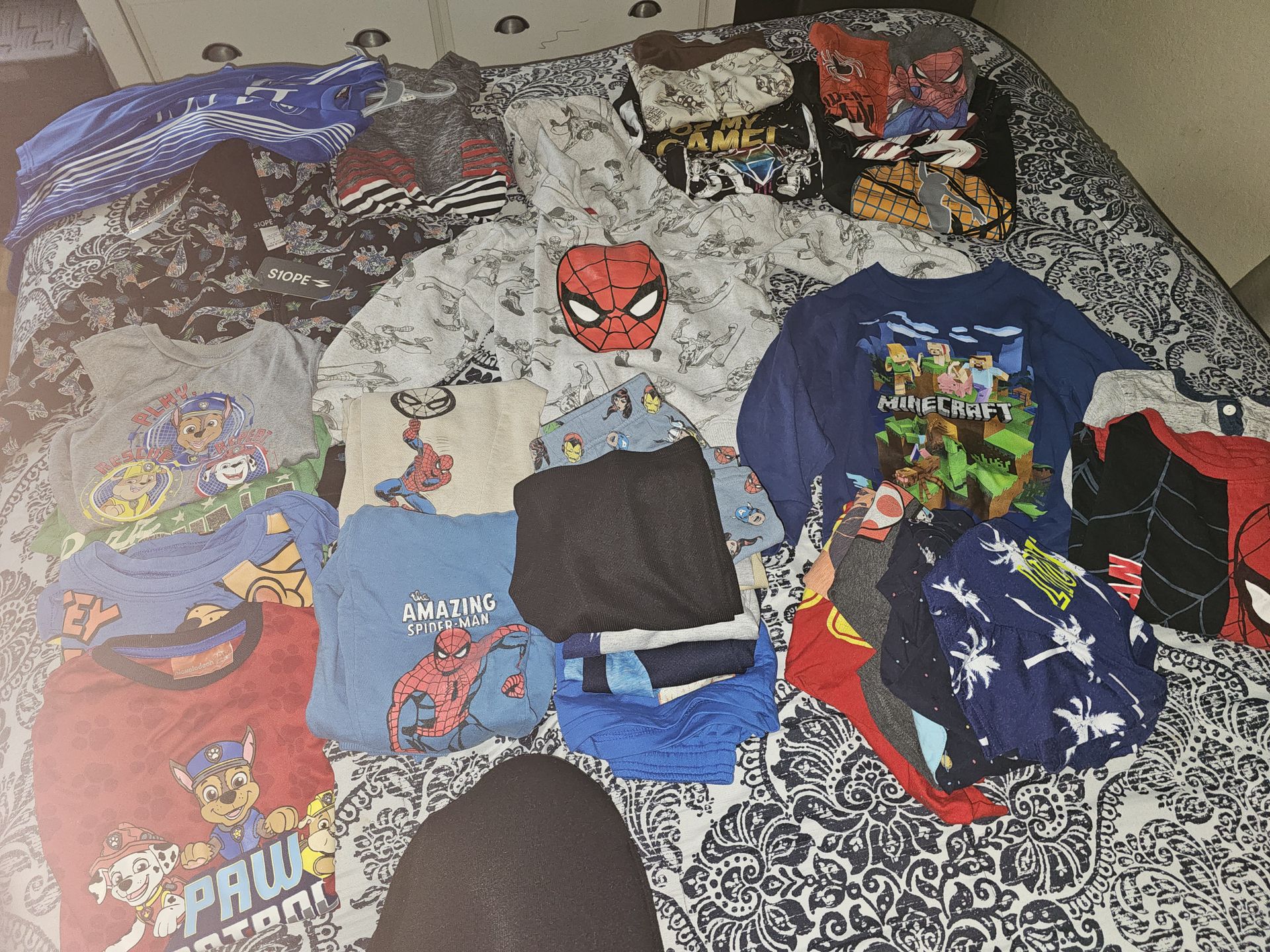 ASKING $5 Lots of clothes. Boys size 7..might be a few 6 and 8s in there. 15 t shirts 2 tank tops 7 shorts 2 pants 2 long sleeve 2 hoodie 1 sweater (no hoodie) 1 BRAND NEW zip up dinosaur hoodie fleece lined sweater 1 BRAND NEW SIZE 8/10 tank top w/short set MUST PICK UP ONLY NEAR FREEPORT AND FLORIN AREA BEFORE THE 16TH.