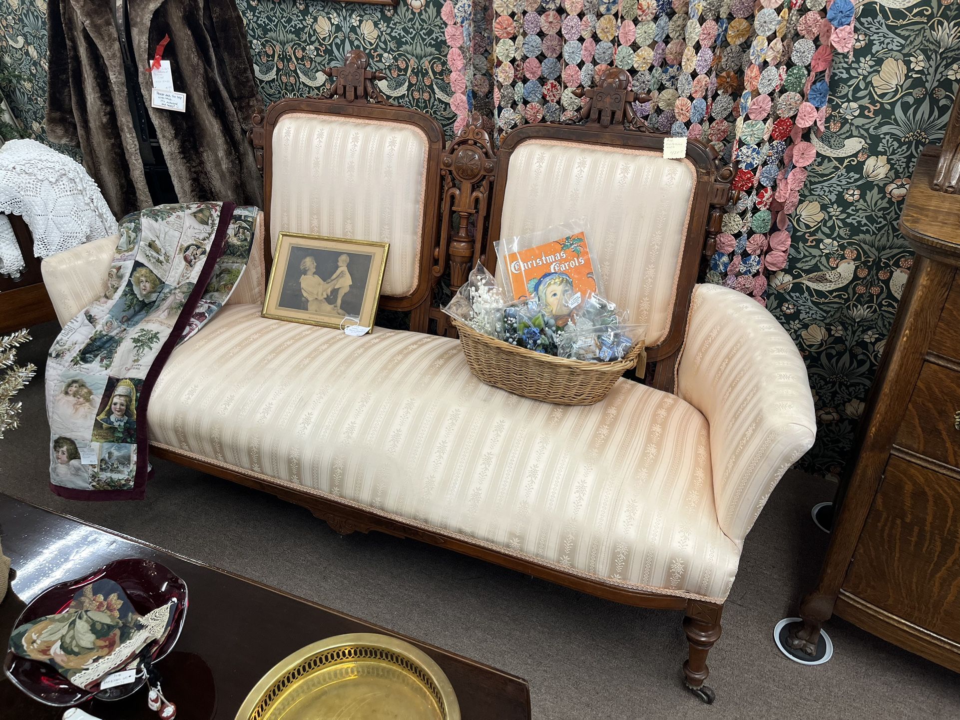 Antique Victorian light pink peach color upholstered settee loveseat. This can be found in booth B8. See photos for location and other info. Measures about: 71” wide, 26” deep, and 43” tall