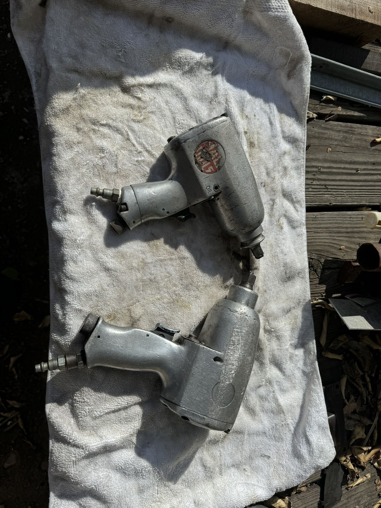 Two pneumatic wrench one is Rockwell brand and the other is Mac tool they both spinning but I don’t know if they work appropriately seems like my air compressor it has not enough air power to move them fast any way they could work with some maintenance or for parts both for 30