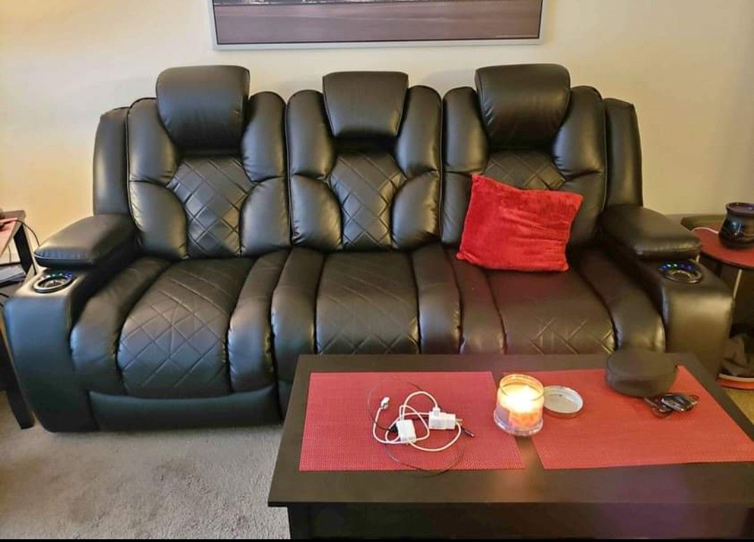 Bob's furniture panther collection power reclining three seat sofa $2500 couch! Asking $1,500 it's in good condition there is a little bit of ware on it but not much everything works it's got obviously the recliner it's got lighted cup holders everything is push button it's got adjustable headrests fold down middle seat with more cup holders reading lamps power bank it's a very cool comfortable couch