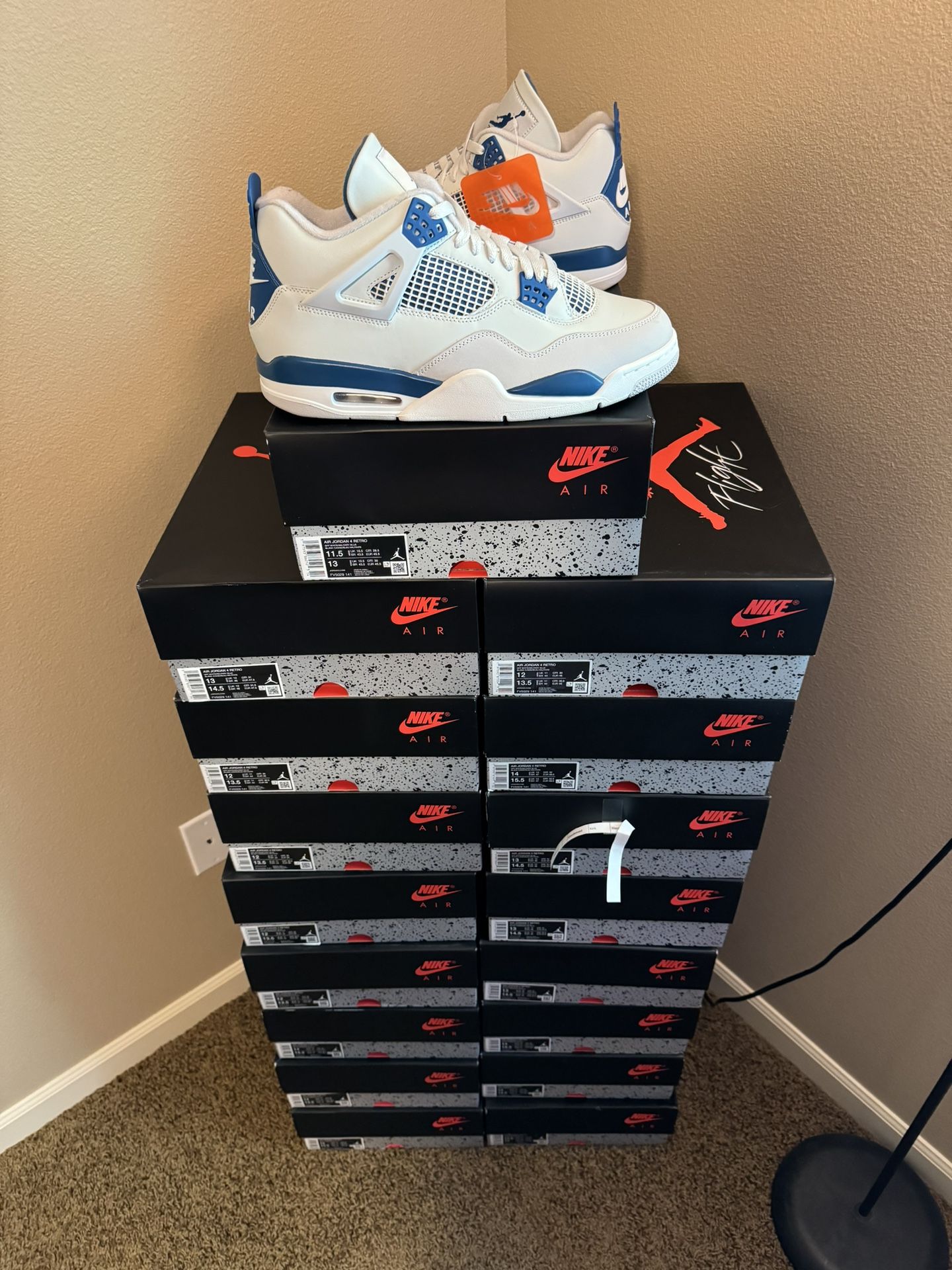 Brand new Air Jordan Military/Industrial 4’s sizes 11.5x1 12x6 12.5x1 13x4 14x4 with original box and proof of purchase.