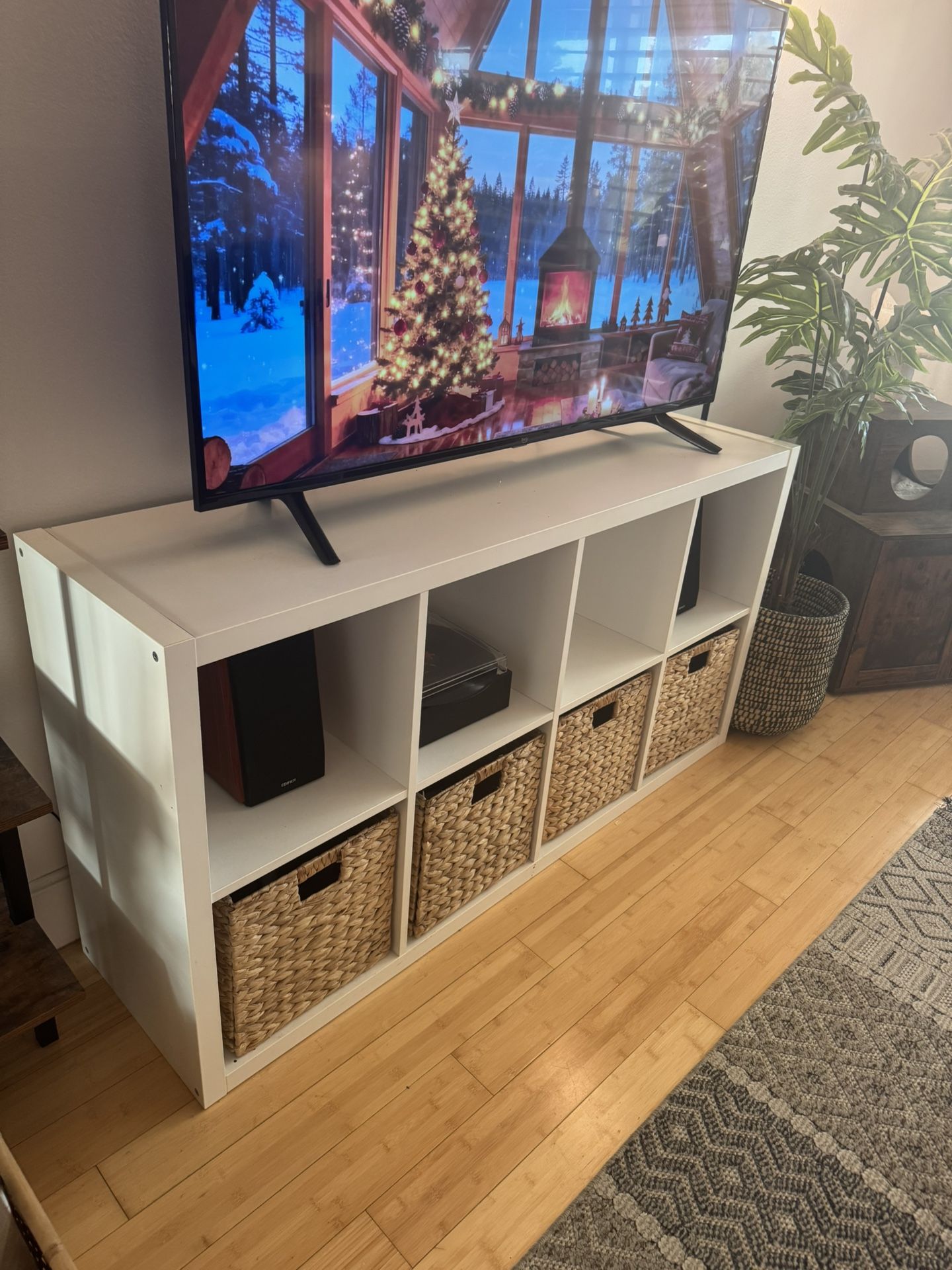 White IKEA cubby storage unit / TV stand in great condition. Clean, sturdy, and very versatile—perfect for a living room, playroom, bedroom, or office. Fits standard IKEA cube baskets (shown with baskets, but baskets not included unless you want to add that). Works well as a media console, toy storage, bookcase, or general organization. No damage, smoke-free home. Pickup only.