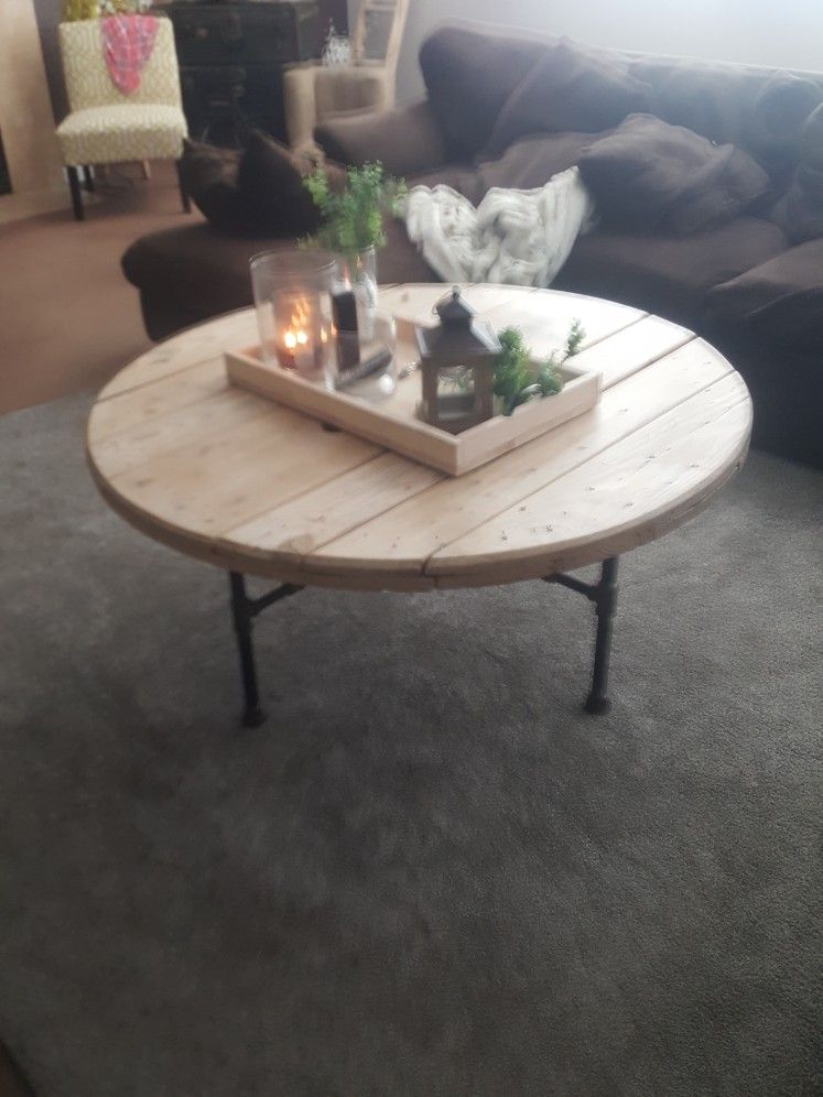 Custom coffee table with black pipe legs. 48" diameter and stands 21" tall