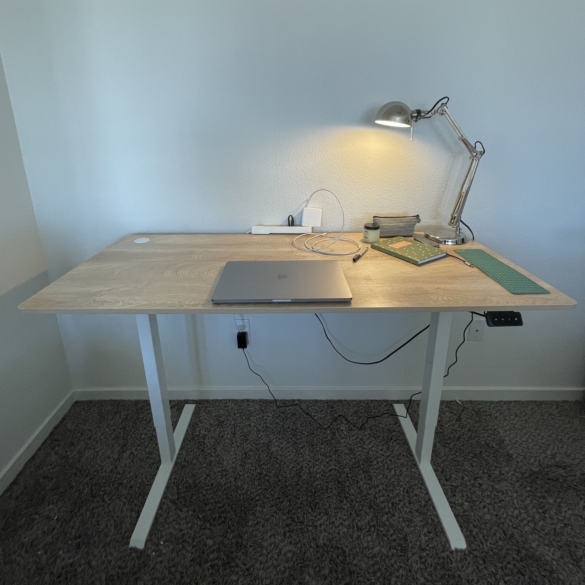 Brand: BANTI Shape: Rectangular Dimensions: 24"D x 55"W x 28"H Color: Maple Style: Modern Intelligent Motor System: Smoothly switching between 27.16" and 46.06" heights, the electric standing desk boasts a crash rebound feature to protect your desk from damage. Desktop workspace: the desktop measures 55" x 24" and can accommodate 2 computer monitors and other office supplies, providing plenty of workspace for your work. Strong Frame: The rising desk frame is made of industrial-grade steel frame that can safely hold up to 176 lbs. Desktop lifting speed: 20mm/s, no-load noise ≤ 55db. Used but in good condition. Looks good and super sturdy.