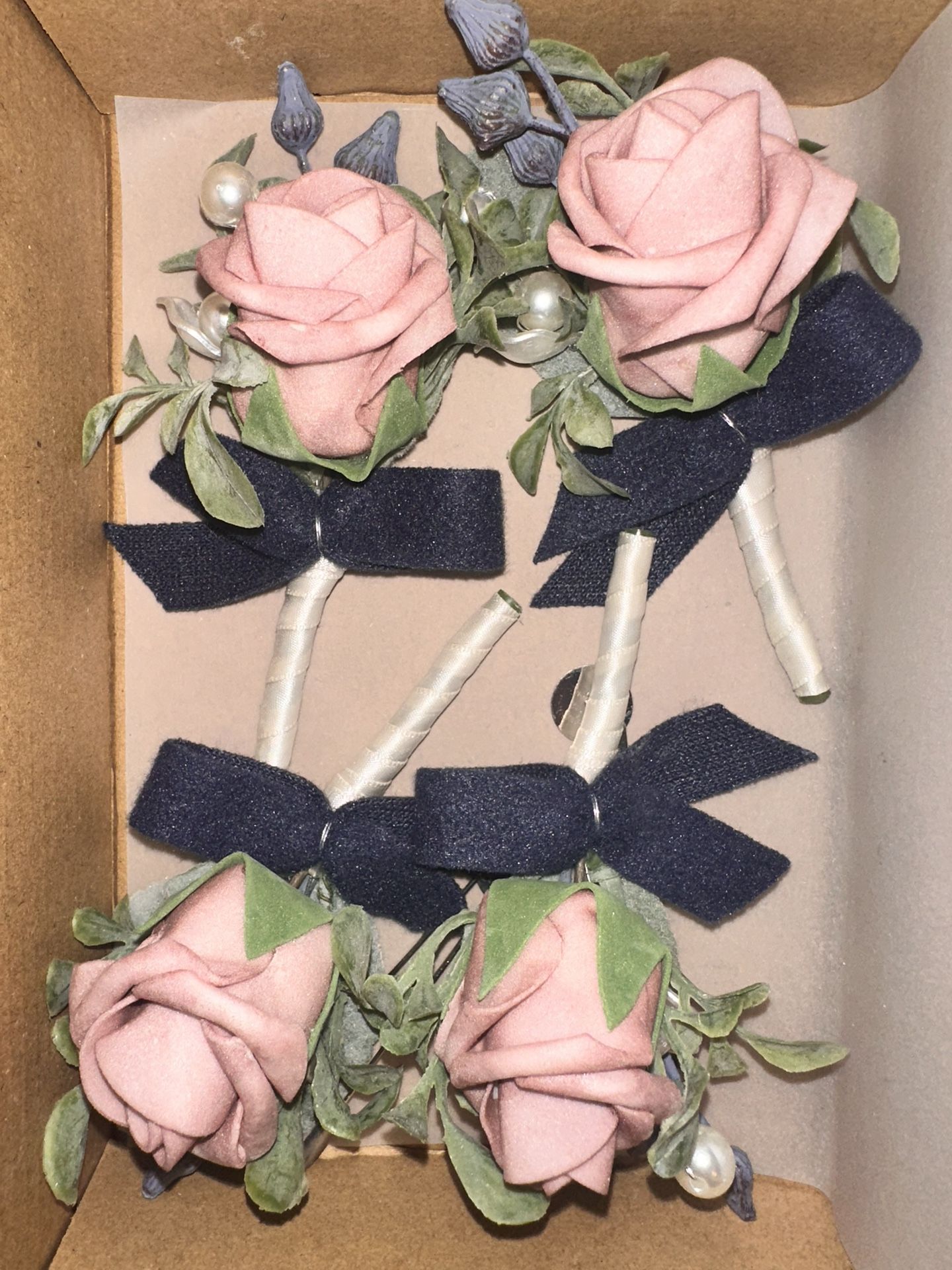 I'm selling a set of 4 Ling's Moment boutonnieres in dusty rose and navy blue. They are artificial flowers perfect for a wedding or prom. They add a nice touch to any suit or jacket. Get these boutonnieres today!