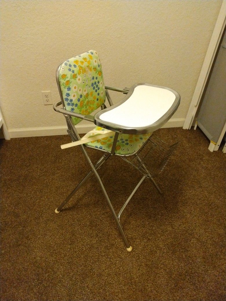 1970/80's kids high chair-great condition hard to find-needs a good Brillo pad scrub on some of the metal but not much-missing one leg bottom cover- has waist belt and adjustable foot rest-found some on line but prices are pretty high-this one can be yours for $65-must pick up-stands 2 feet 11 inches.