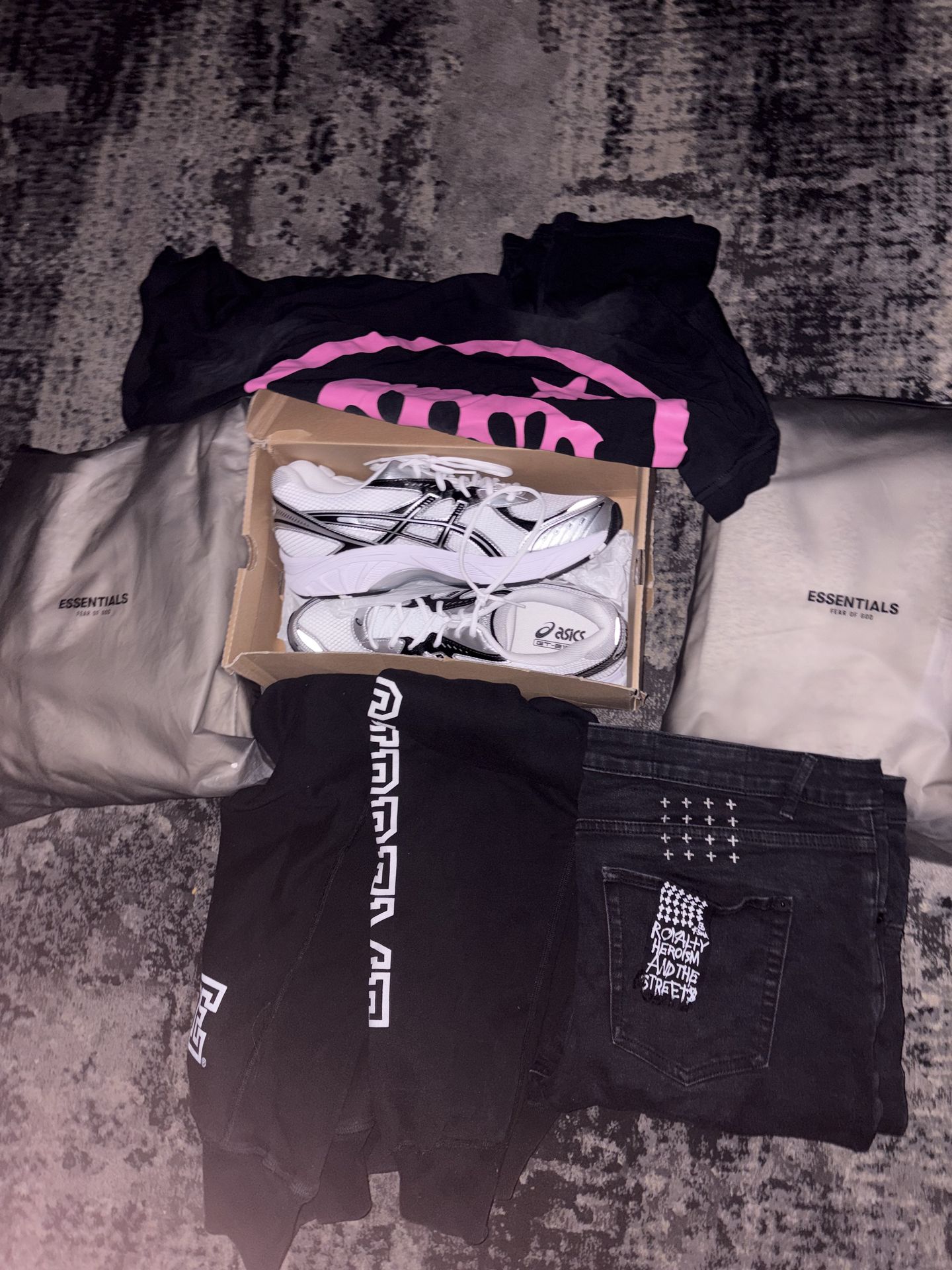 Hellstar worn once, ksubi size 38, asics, essentials, supreme hoodie Large worn 2x Hellstar Hoodie Ksubi All cleaned at the cleaners Price is the not real price for all these if you want to buy text my ig in the title