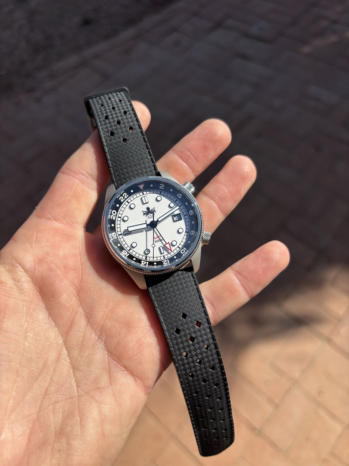 Like new condition with box and papers! Specifications REF.: PX023G Dial: White Caliber No.: SWISS RONDA 515-24H Case: 316L Stainless steel Band: 20mm width Black FKM Rubber Strap with quick-release spring bars Glass: Double Domed Sapphire crystal with 3 layers anti reflective under coating Water resistance: 300M(1000ft) suitable for Swimming & Snorkeling & Scuba Diving Case size: Diameter 41.0mm. Thickness 10.5mm. 47mm lug to lug Weight: 85g (with band) Bezel: bi-directional bezel Crown: Screw-Down crown Lume: 12 layers Super-LumiNova BGW9 on hands, indices and bezel marking