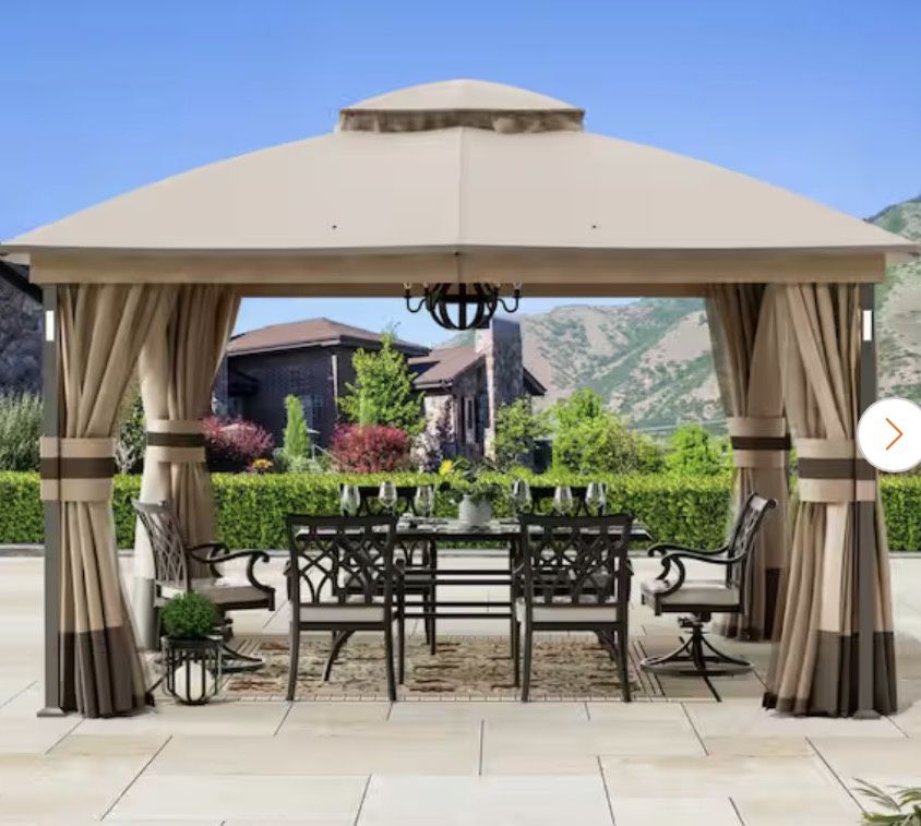 Patio Gazebo 11 ft. x 13 ft. with LED Lights and Bluetooth Speaker, Netting and Curtains, Brown