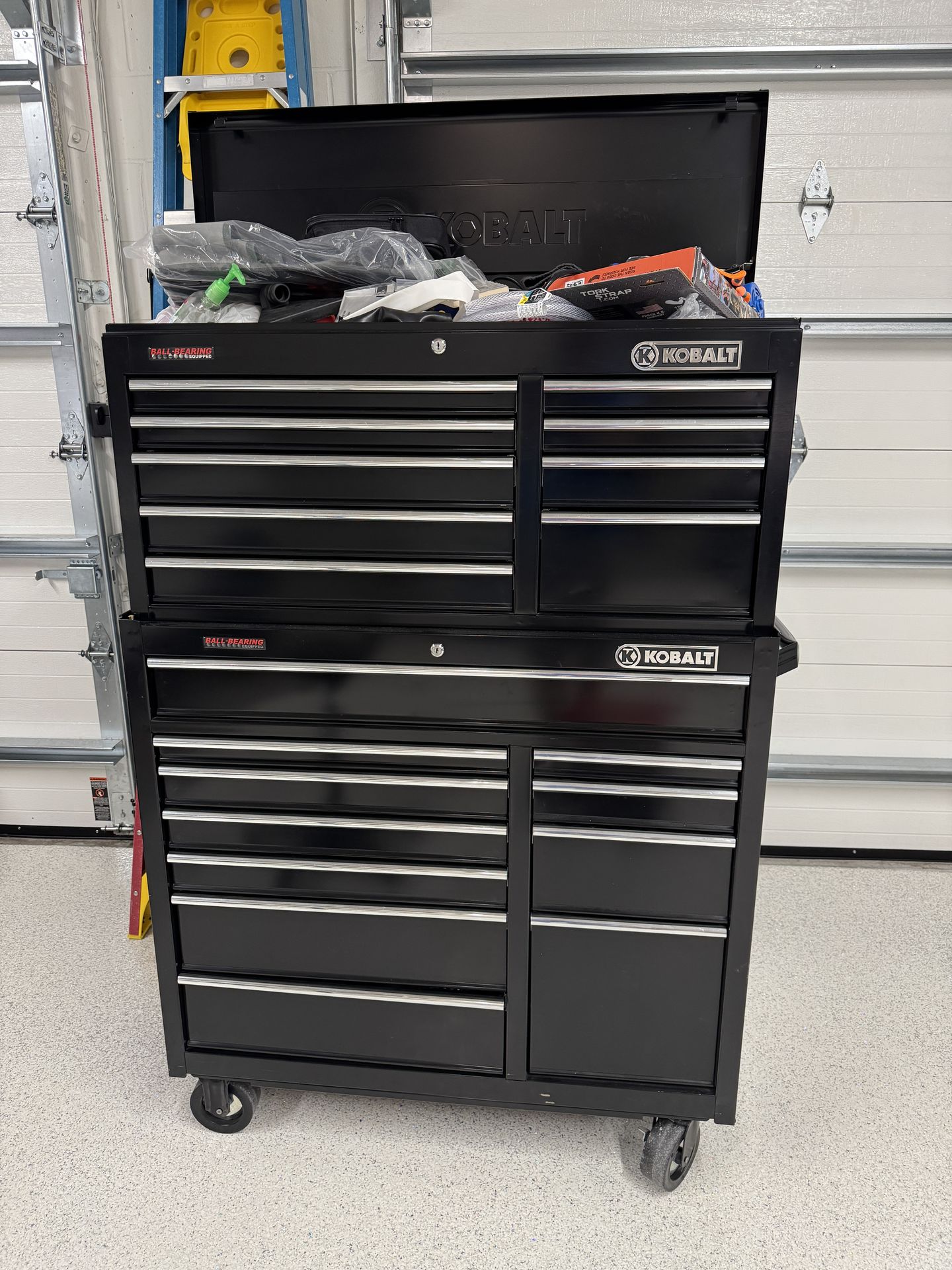 Large Black rolling bottom and top tool chest with casters ball bearing drawers matching key locks lower toolbox is 41 inches wide by 18 inches deep 41 inches tall and upper to a box is 40 1/2 inches wide by 16 inches deep and 19 inches tall. Toolboxes are in great condition. Buyer will need to come and pick up with either a pick up truck, moving van, trailer, or similar type vehicle. Will help load. Cash only. No trade.