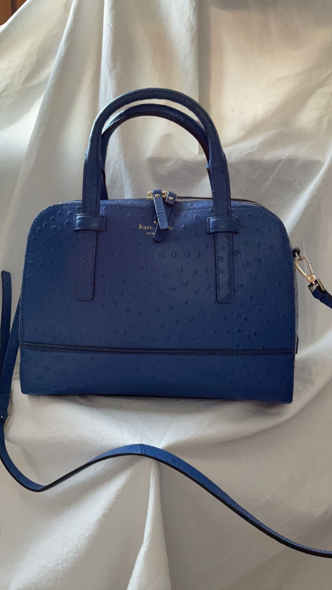 Beautiful blue Ostrich embossed leather with monza smooth leather trim. Capital kate jacquard lining & 14-karat gold plated hardware. It’s a top handle bag with zip top closure & removable adjustable strap that you can wear cross body leaving you hands free. It has interior zip & double slide pockets plus exterior slide pocket. I have received so many compliments on this bag.
