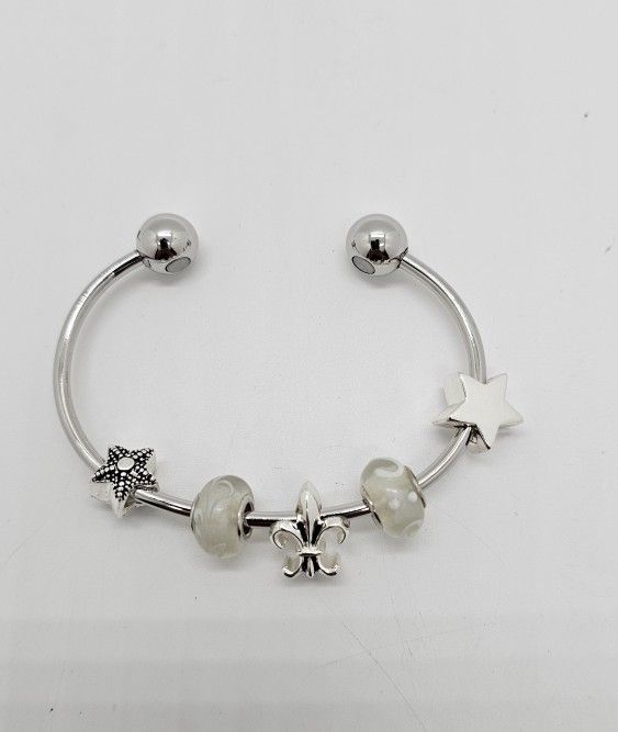 Beautiful designed white and silver charm bracelet. This cuff bangle design ensures it is very easy to take on and off but can be secured by shaping the bangle to your wrist size. Brand New