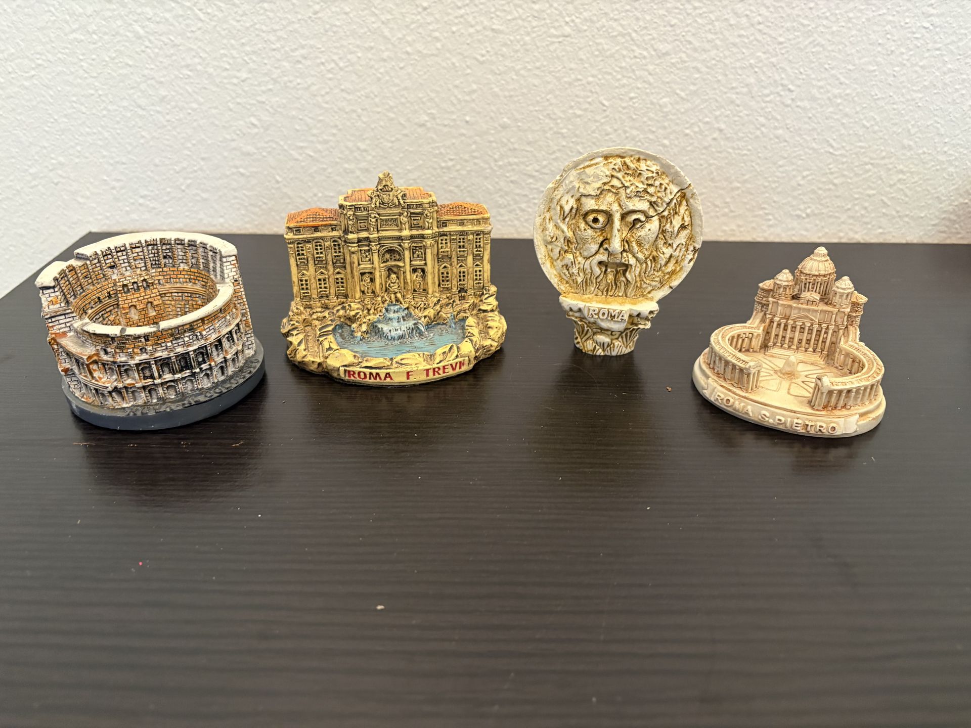 Cool set of four Rome souvenir statues. Has the Colosseum, Trevi Fountain, a Roman head sculpture, and St. Peter's Basilica. Great decorative pieces for anyone who loves Italy or collects travel souvenirs.