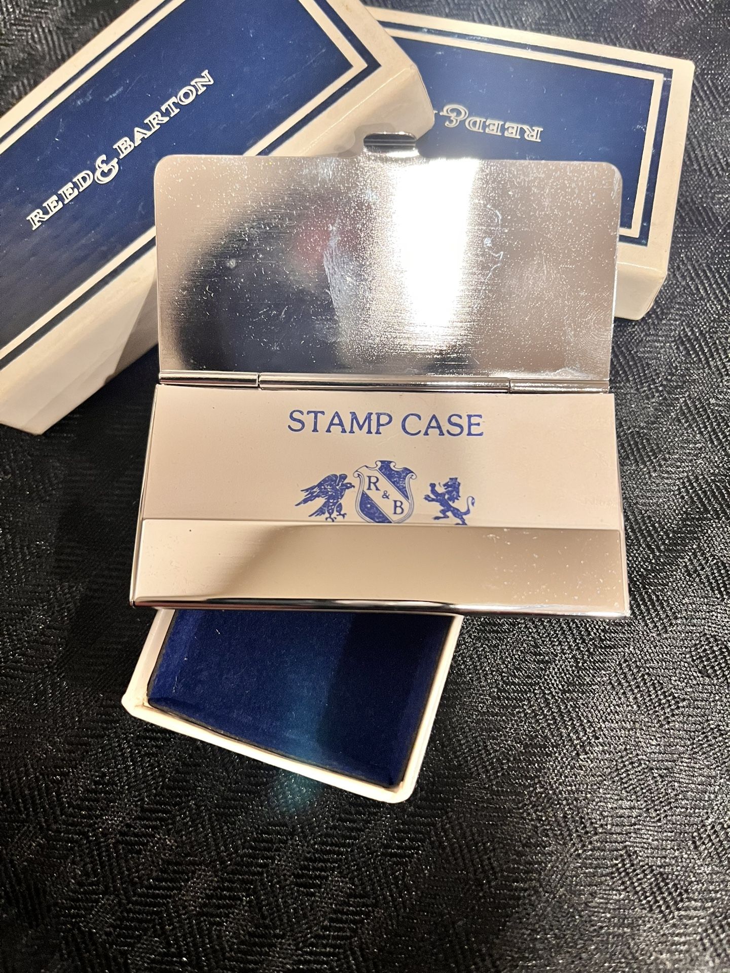 Reed & Barton Silver Plate postage stamp signed case. This Item is new old stock & comes in its original box lined with blue velvet, stamp case also has the original insert sleeve. This D. & B. Case is signed Reed & Barton. Asking $16.00 each , as I have 2 of them. Thanks for looking.