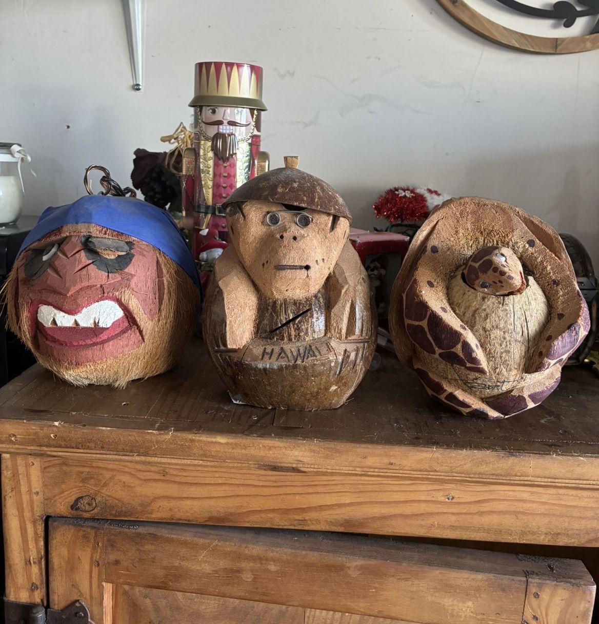Cash Only Small Chest 6 1/5” x 5” Brown & Carved Coconut Decor Pirate 7” Tall 6” Wide Monkey 8” Tall 6” Wide Turtle Almost 7” Tall 6” Wide & Turtle Bottle Cap Opener 5” Long Steel
