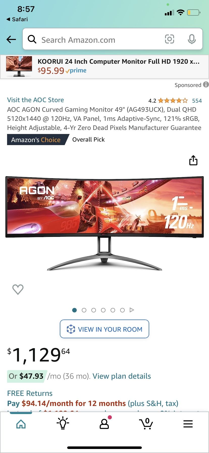 Owned 3 years / (used 1 year ) very good condition and amazing experience for ultra wide gaming! Selling because I don’t use it anymore Will post pictures later, monitor is at my old house [make an offer] 49 inches of wrap-around immersion will change the way you experience your favorite games. The AGON AG493UCX features an enormous curved, dual quad VA panel that reaches more of the color spectrum, and its VESA DisplayHDR 400 screen means deeper blacks and color arrays that pop. With the speeds and feeds you would expect from AGON’s flagship monitor, your gaming will be fast, crisp, and free of ghosting and blur which could otherwise affect your performance. Features: 49” with 5120x1440 DQHD resolution. VA curved panel for wide viewing angles and world class colors Color gamut 90% Adobe RGB and 121.6% of sRGB VESA DisplayHDR 400 for bright, vibrant, and realistic colors Rapid 1ms response time (MPRT) and 120Hz refresh rate 2 x DisplayPort and 2 x HDMI connections Built-in KVM switch to easily switch between sources AMD FreeSync Premium Pro to reduce stuttering and tearing