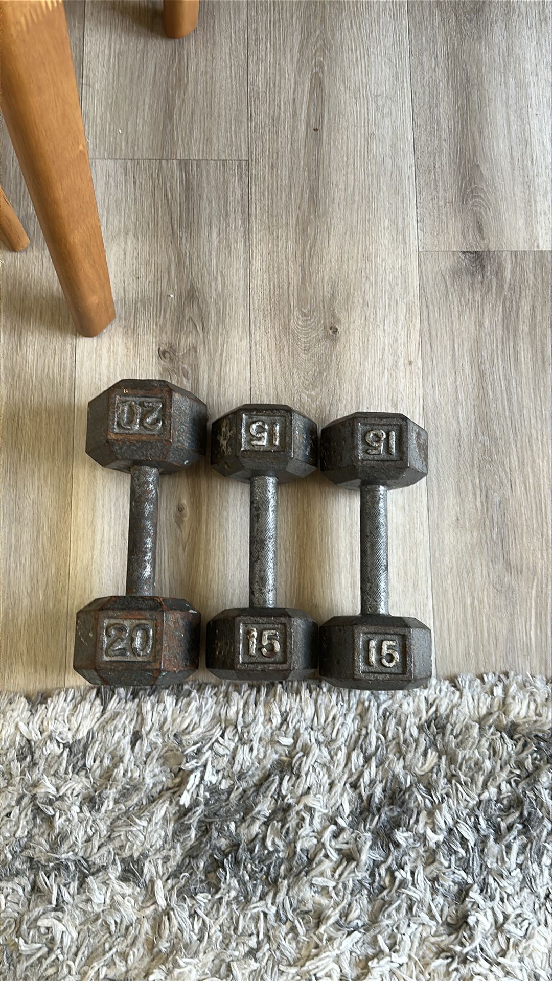 CONDITION: Used - Good DESCRIPTION: Cast iron dumbbell set - 50 lbs total. Two 15lb dumbbells and one 20lb dumbbell. ✓ All weights clearly marked ✓ Heavy-duty cast iron construction ✓ No cracks or damage ✓ Ready to use for home gym or training ✓ Vintage/retro style cast iron (quality material lasts forever) ✓ Great for strength training, building muscle, and conditioning Perfect starter set or addition to existing home gym. Cast iron is built to last. Local pickup only, San Diego. Cash or Venmo. First come, first served—no holds.