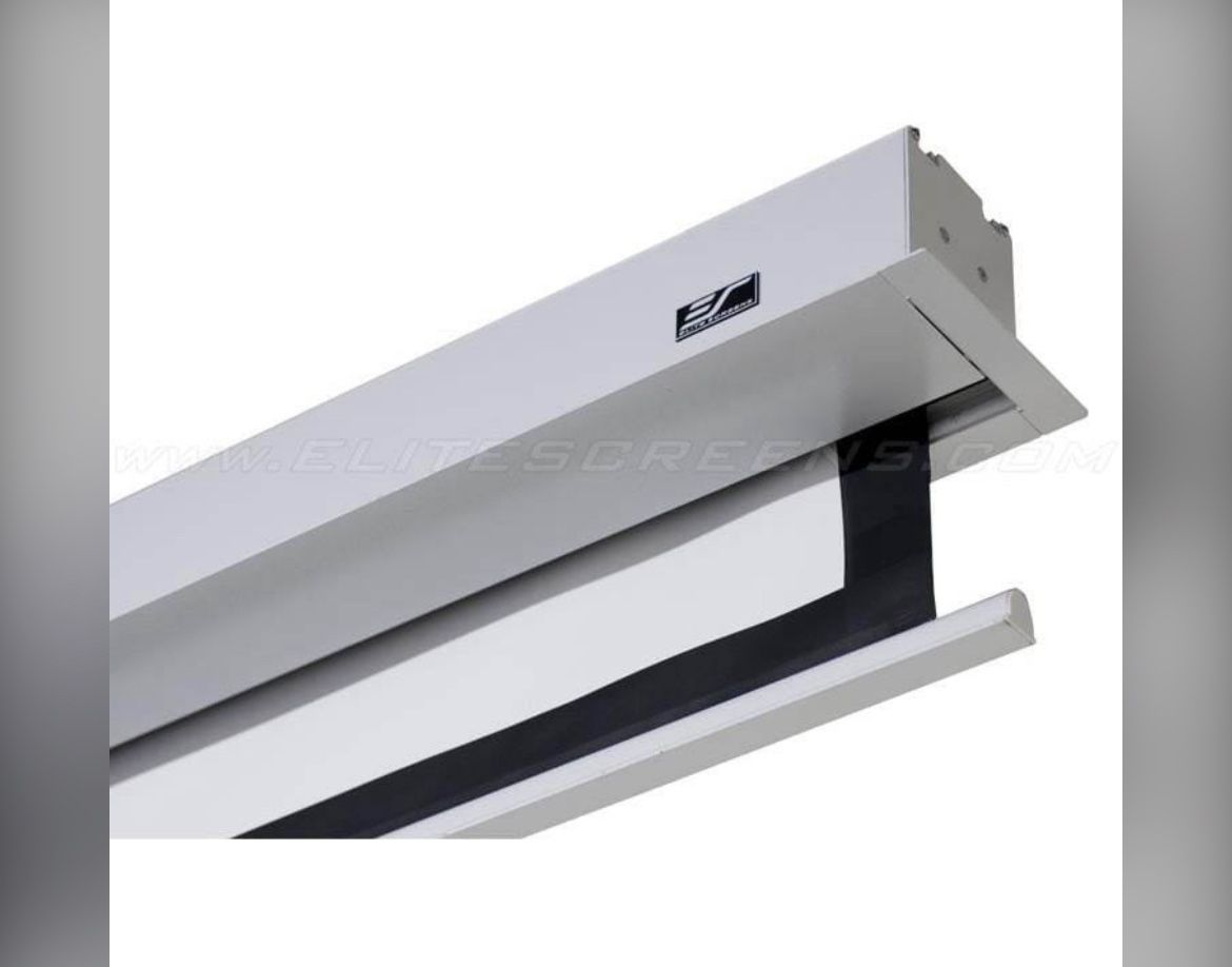 Brand New in the Box. The Elite Screens Black Diamond Zero Edge Electric Screen Vmaxt97 is a brand new ceiling-mounted projection screen with a size range of 84-139 inches. It features a sleek white color and utilizes MaxWhite screen surface material for high-quality viewing. This screen is compatible with multiple aspect ratios including 16:9, 2.35:1, 4:3, and 16:10, making it versatile for variousi content types. The Zero Edge design provides a borderless viewing experience, ideal for home theaters and professional setups