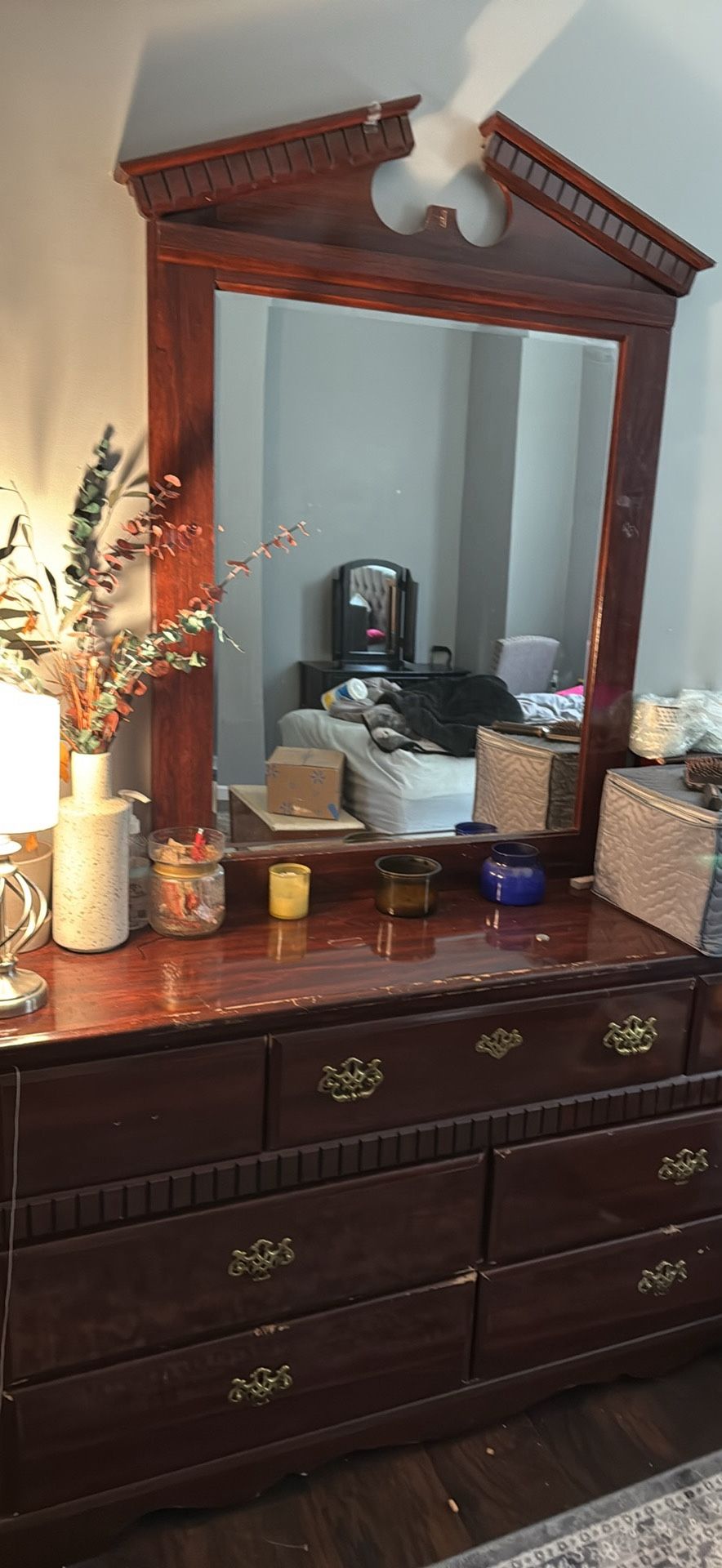 Dresser in okay condition. H 34”, L 60”, D 16” most drawers not aligned and missing hardware. Large mirror attached. Mirror - H 50”, W 37”. $100 OBO