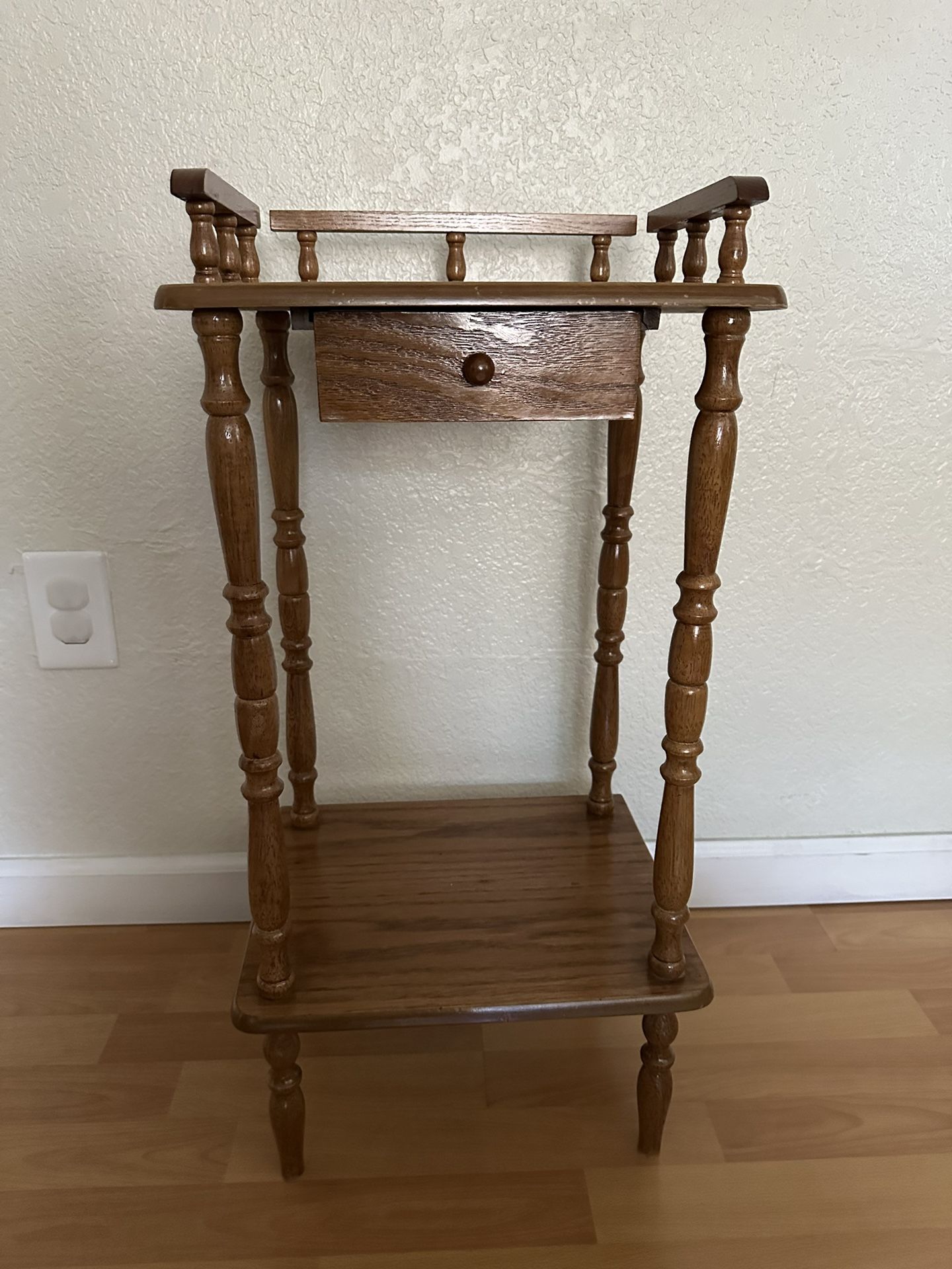 Dimensions: 26 inches tall by 13.5 inches wide by 12 inches deep Small drawer Has some minor blemishes and scratches due to wear and tear.