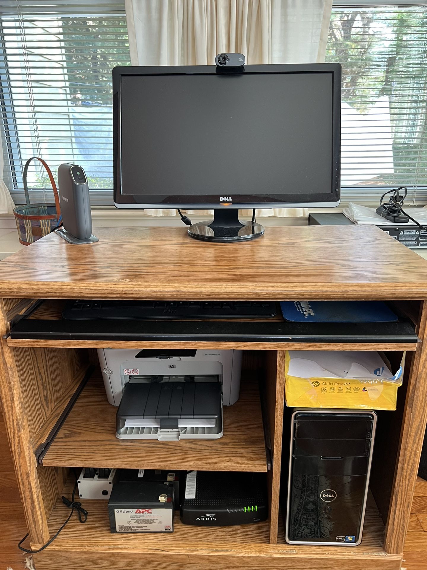 Computer workstation with pull out keyboard tray and printer shelf