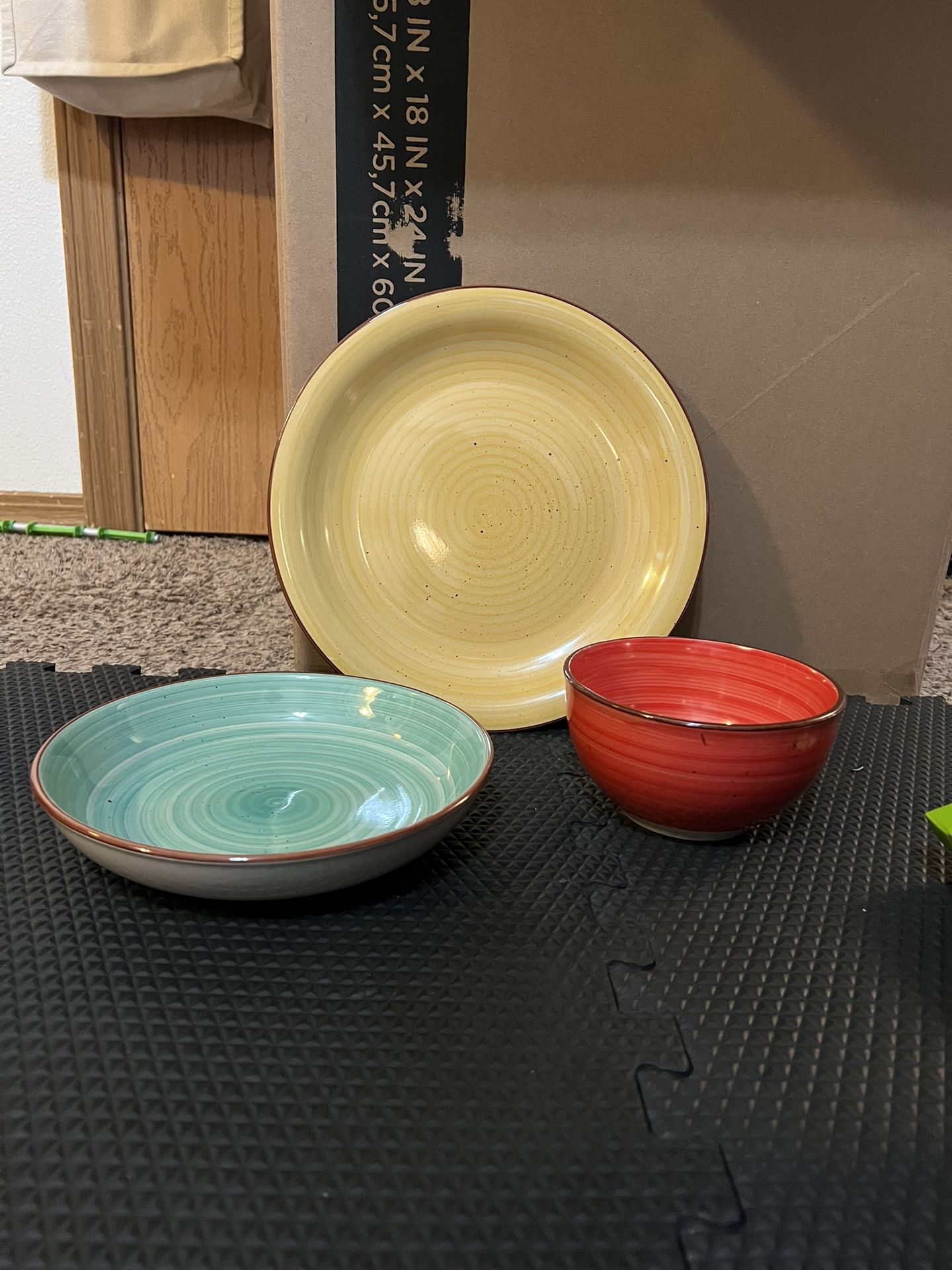 Never used 24-piece Gibson Home Color dinnerware set. 8 plates 8 soup bowls 8 cereal bowls Dishwasher and microwave safe.
