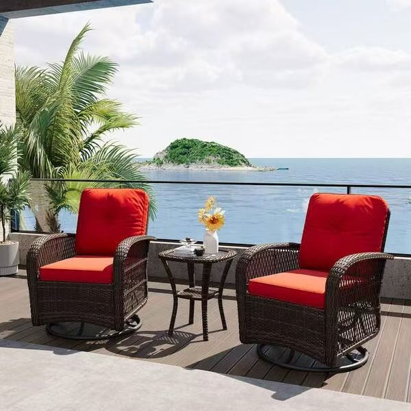 Brown 3-Piece Wicker Swivel Rocking Chairs Outdoor Dining Patio Conversation Set with Red Cushions $180