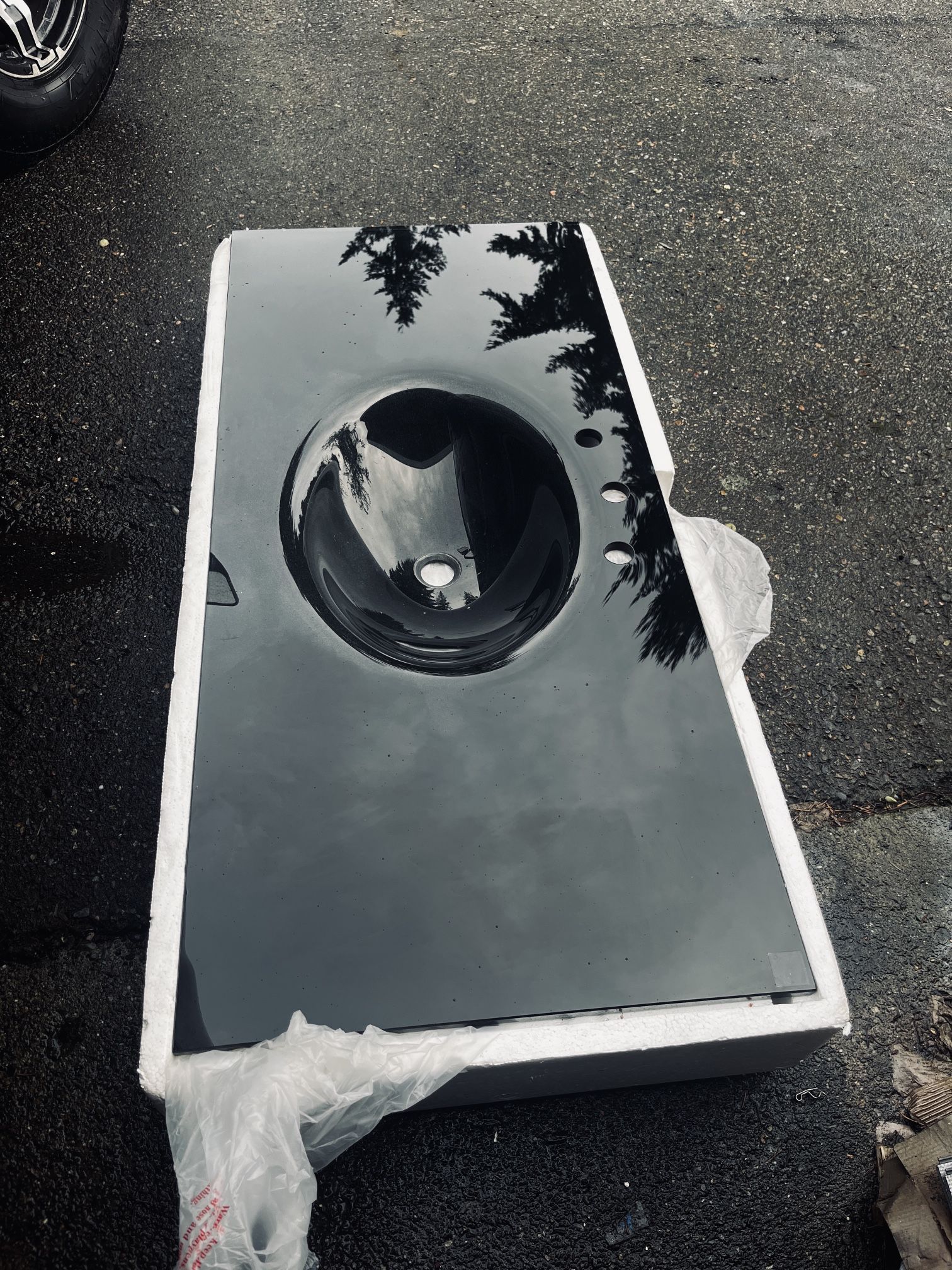 Never used, perfect condition. Glass top, black shadowed. Beautiful top. Dimensions are 49in X 22in Holes are all 1.5in diameter. Sink is about 20in X 15in, maybe +1in, refer to photos for measurements. Included the trim backdrop. Has a couple minor scratches. Can be fixed with toothpaste. Price compared to $750, Open to offers.