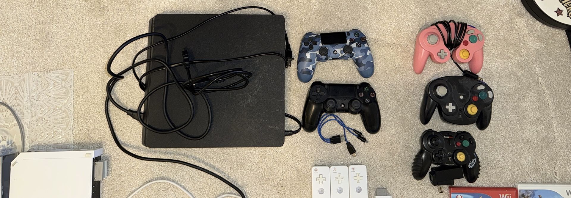 Selling off my collection! All items are tested, working, and come from a smoke-free home. I am looking to sell these as groups or as one large lot. PS4 Group: Console, 2 controllers, and all wires. Wii Group: Console, 3 remotes, Guitar Hero guitar, and 6 top-tier games GameCube Group: 3 controllers (including the rare pink one) and NBA Street Vol 2.