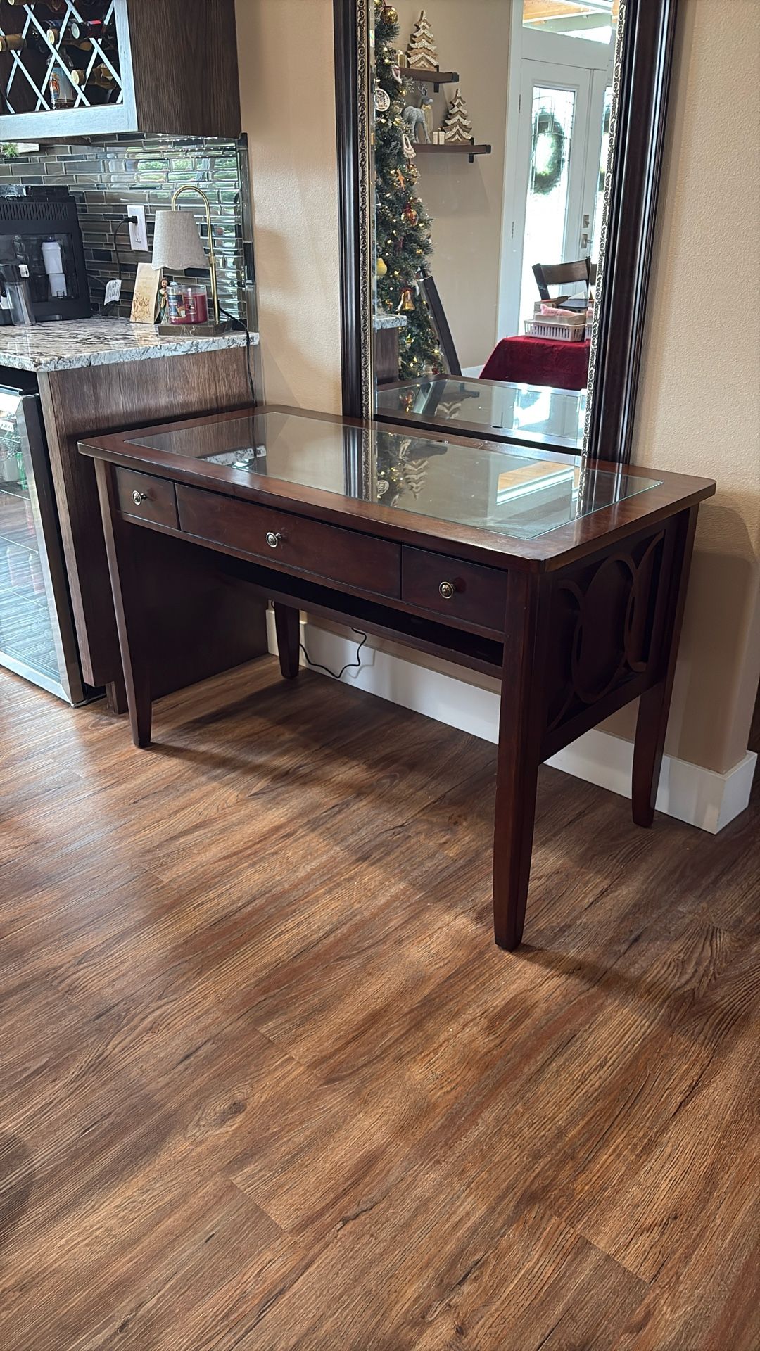 Mahogany color desk with 3 drawers and pull out center drawer with keyboard tray. Also has storage shelf, hole for cords and metal cord attachments for keeping cords hidden. Glass inlay in top of desk for display of photos or other items.