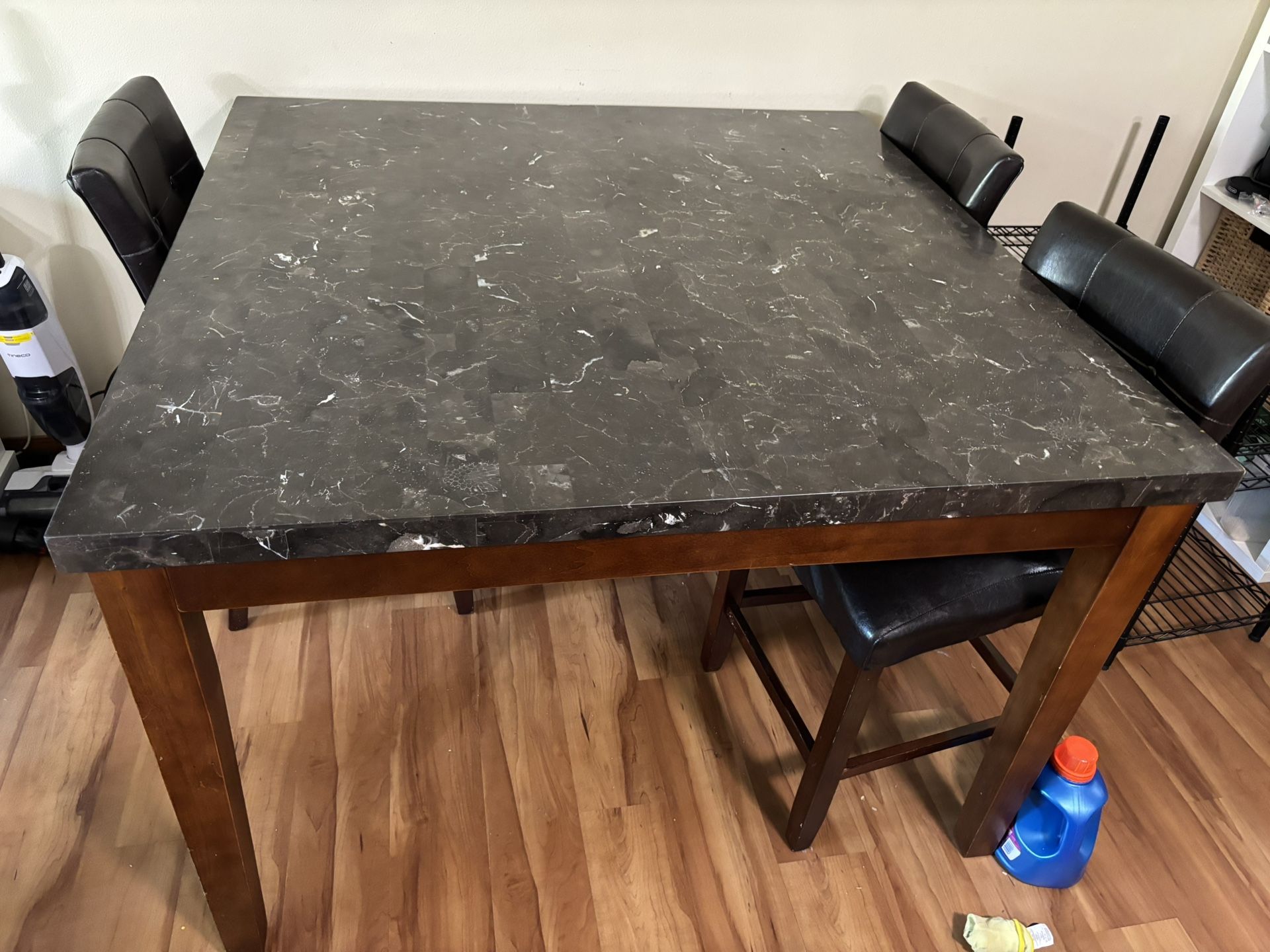 This is a heavy bar stool table. Will need extra bodies to load up. Normal wear and tare been used for a a few years. Table only no chairs. Come get it it’s your for Free!!!