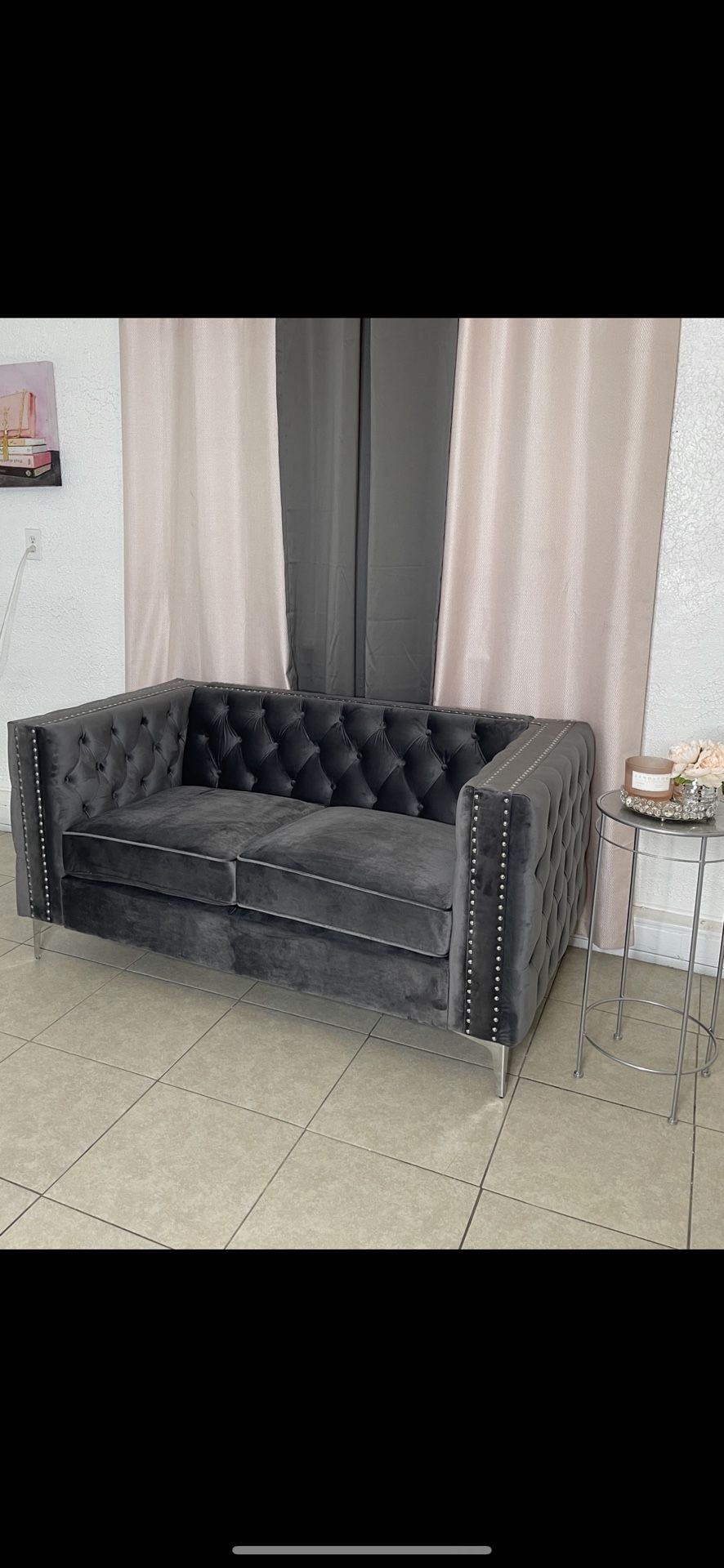 Modern Luxury grey quilted sofa love seat velvet