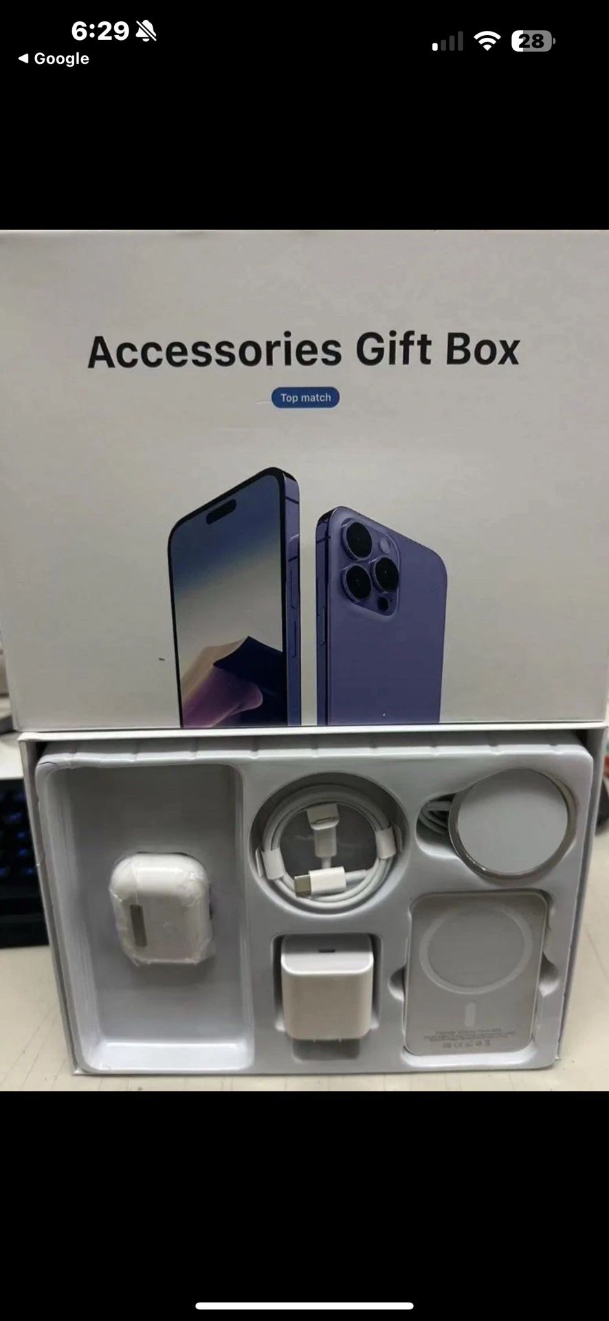 Box sealed The Top Match Accessories Gift Box Set 5 In 1 for iPhone is a versatile and convenient bundle that includes essential accessories for your iPhone. The set includes a battery pack, charging cable, airbuds, 20W adapter, and Magsafe Charger, all neatly packaged in a white box. The accessories are designed for Apple iPhones and feature magnetic and wireless charging capabilities, making them easy to use and perfect for on-the-go use. Made of lightweight TPU material, this gift box set is a practical and stylish accessory for any iPhone owner.
