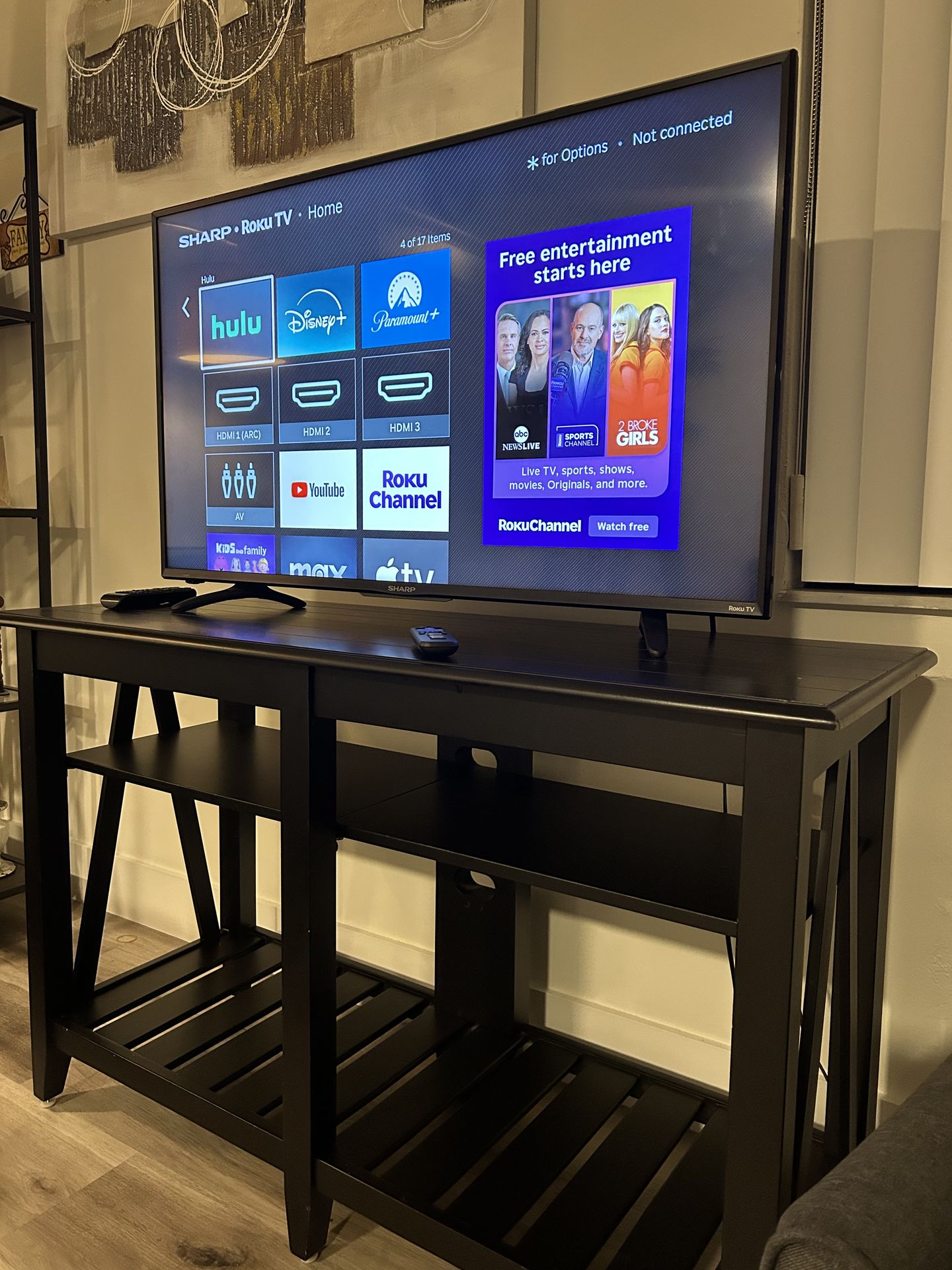Sharp roku smart tv 43’’ inch with table stand works great both are in great condition $130 will deliver both for a fee for gas