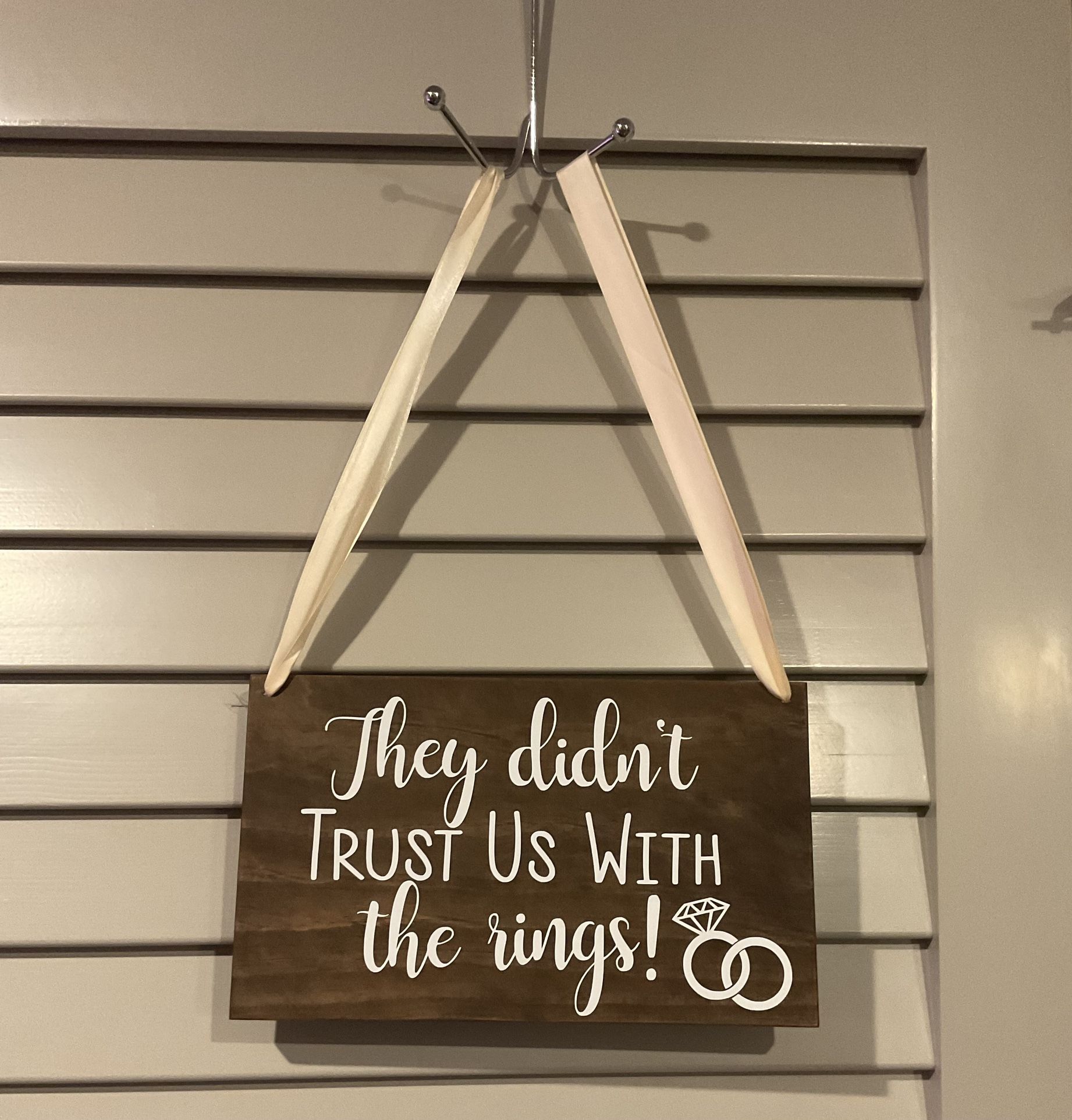 Originally ordered via Etsy. Only used once. Ribbon Color: Ivory Stained Dark Wood Sign Length: 12in Sign Width: 7in Sign Thickness: 0.75in Full Sign Length (sign + ribbon lengths): 34in