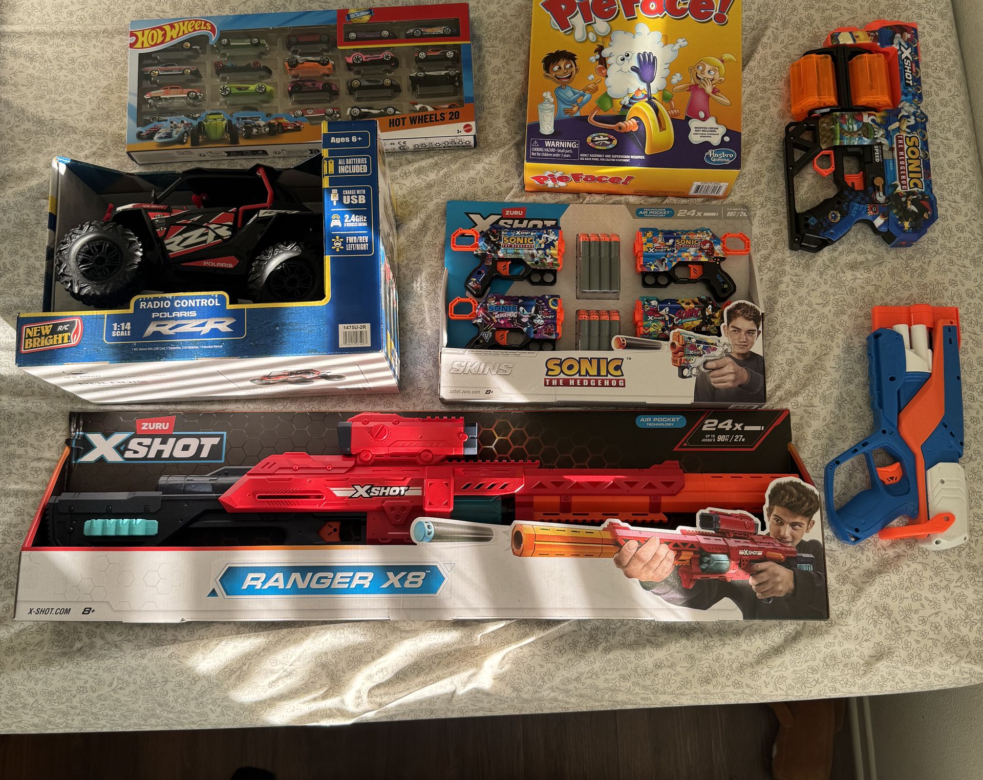 Brand new RC Polaris car, new 20 pack of hot wheels, new x shot nerf gun, new 4 pack of sonic nerf guns and 2 used nerf guns. The pie face has been taken! All new, free for anyone who wants them for their child/ren!