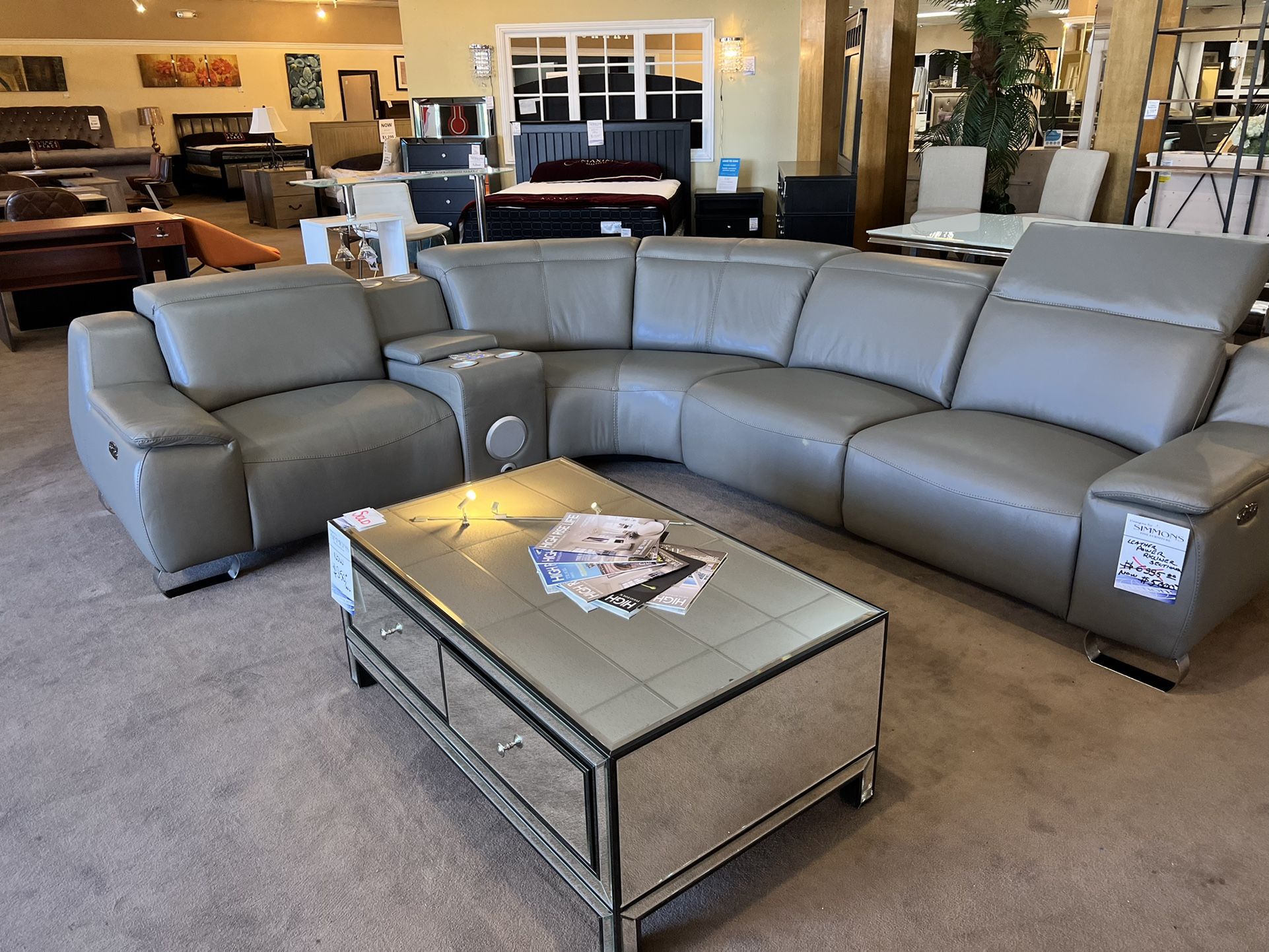Grey Leather Sectional Recliner w/electrical, USP, Speaker
