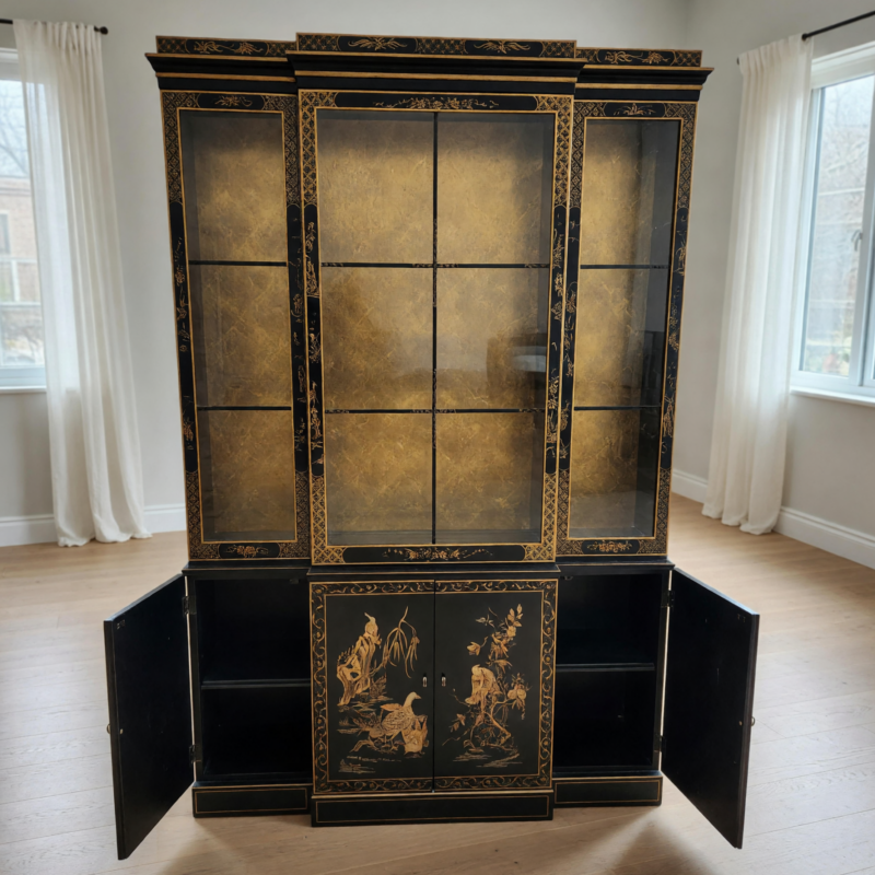 This stunning 1970 Drexel Heritage Chinoiserie China Cabinet is in good condition, showcasing its timeless elegance. It’s a two-piece set with a black lacquered finish, featuring intricate hand-painted motifs and gold gilt details on the front and sides. The top section has three doors with glass shelves, illuminated from above against a gold leaf background. Below, two additional doors open to more shelving for extra storage.\n\nCrafted from wood and glass, this breakfront cabinet offers ample display and storage space. The design reflects classic Mid-Century Asian-inspired styling, making it a standout piece for any dining or living area. All assembly components are included, ensuring you can set it up with ease.