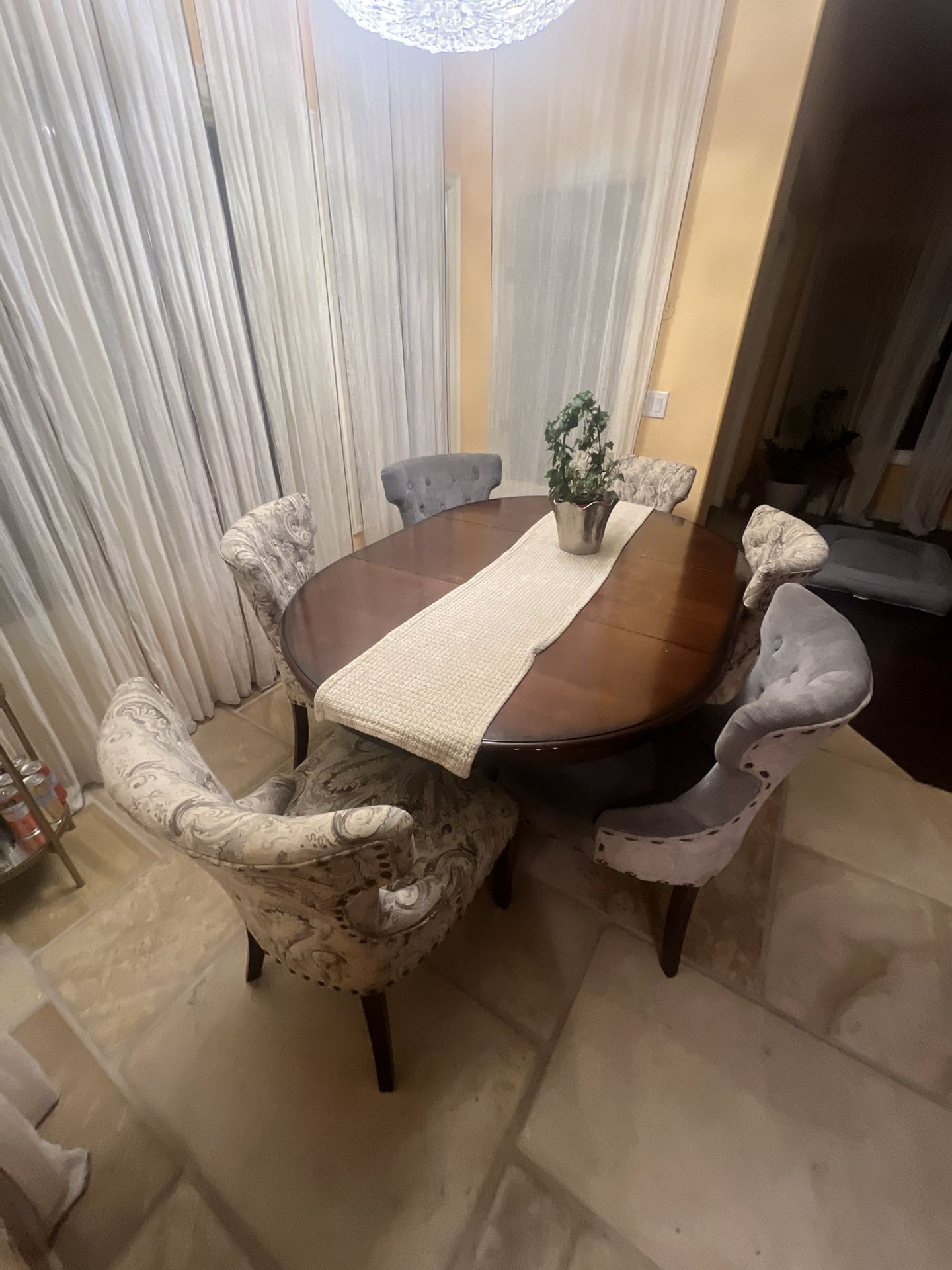 Oval wooden dining table. Can be closed to circle. With six upholstered chairs. Have wear but is very solid and can be refinished. Willing to sell separately as well.