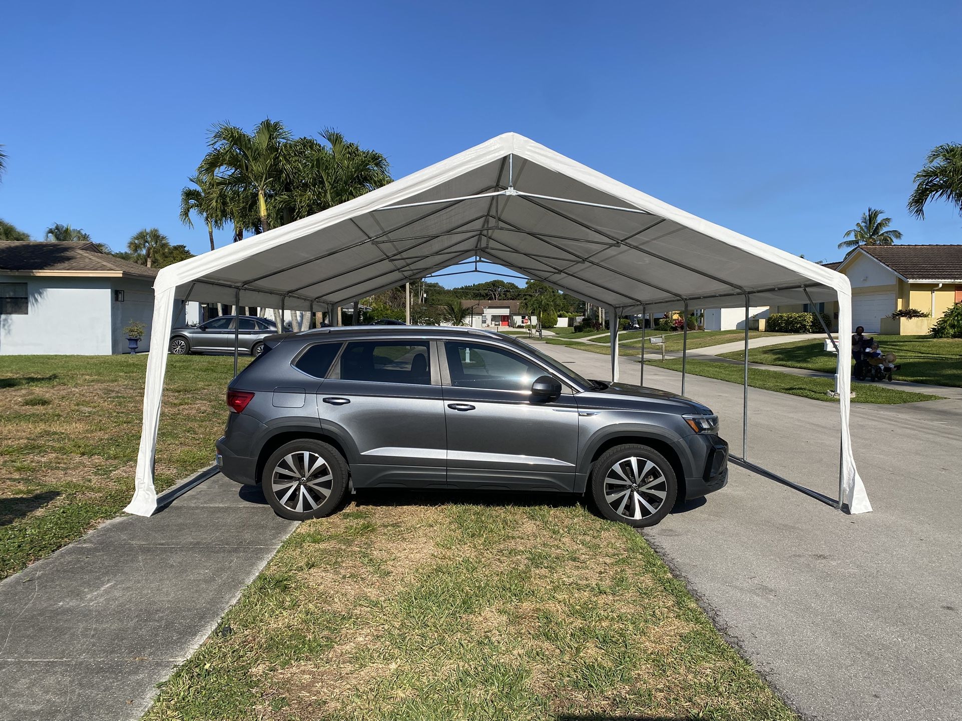 This is a large tent wide enough for a car to drive through. It can be used to cover cars or an outdoor party. We have the side walls, but they are folded up and I’ve never been installed. There is one very small tear in one of the strips on the corner, it is shown in the photos. It does not seem to hamper any functionality.