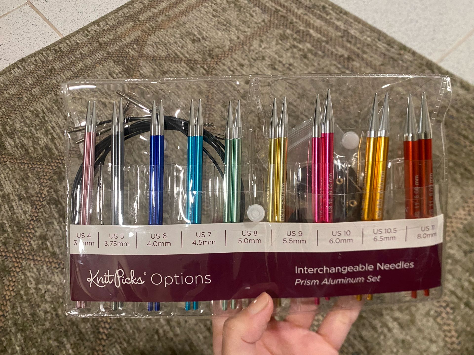 Comes with everything: 9 needles ( US 4-10, 10.5, and 11), 4 cables (2 24”, 32”, 40”) cable end caps and cable key and connector. Barely used, selling because I prefer my bamboo needles.